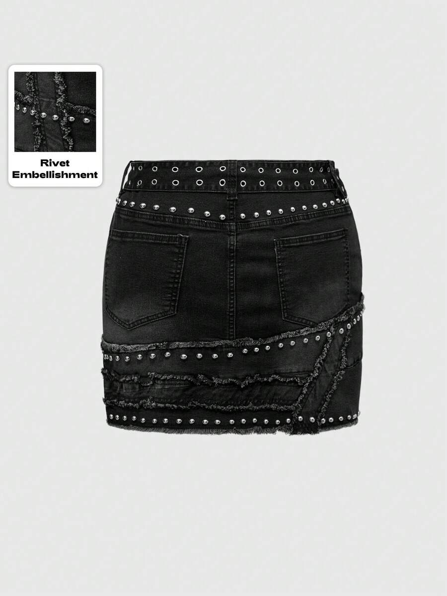 Grunge Punk Falda de mezclilla desgastada con remaches vintage estilo punk grunge para mujer de talla grande, cinturón de metal con ojales para mujer de talla grande con diseño desflecado y borde sexy para otoño/invierno