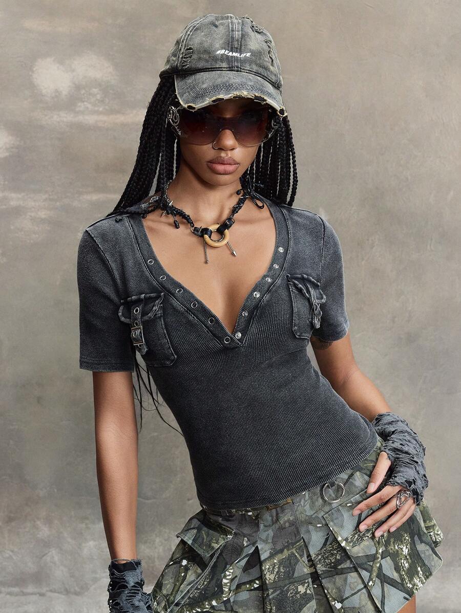 Grunge Punk Camiseta suelta de manga corta y cuello redondo con bolsillo canguro, lavada y desgastada de estilo vintage para mujeres, negra/gris, para el verano, la playa, la graduación, Pascua, conciertos, Nashville, vacaciones