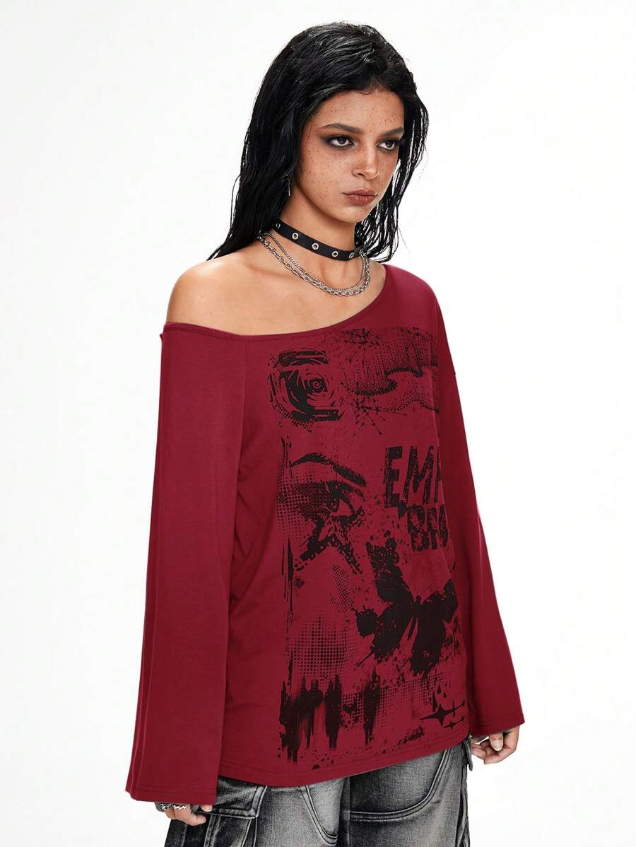 Grunge Punk Camiseta holgada con estampado punk del yermo, con hombros oblicuos y vuelo