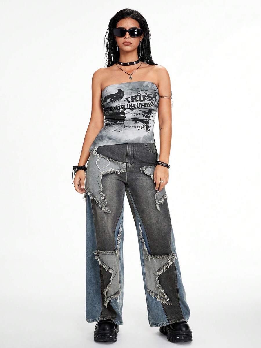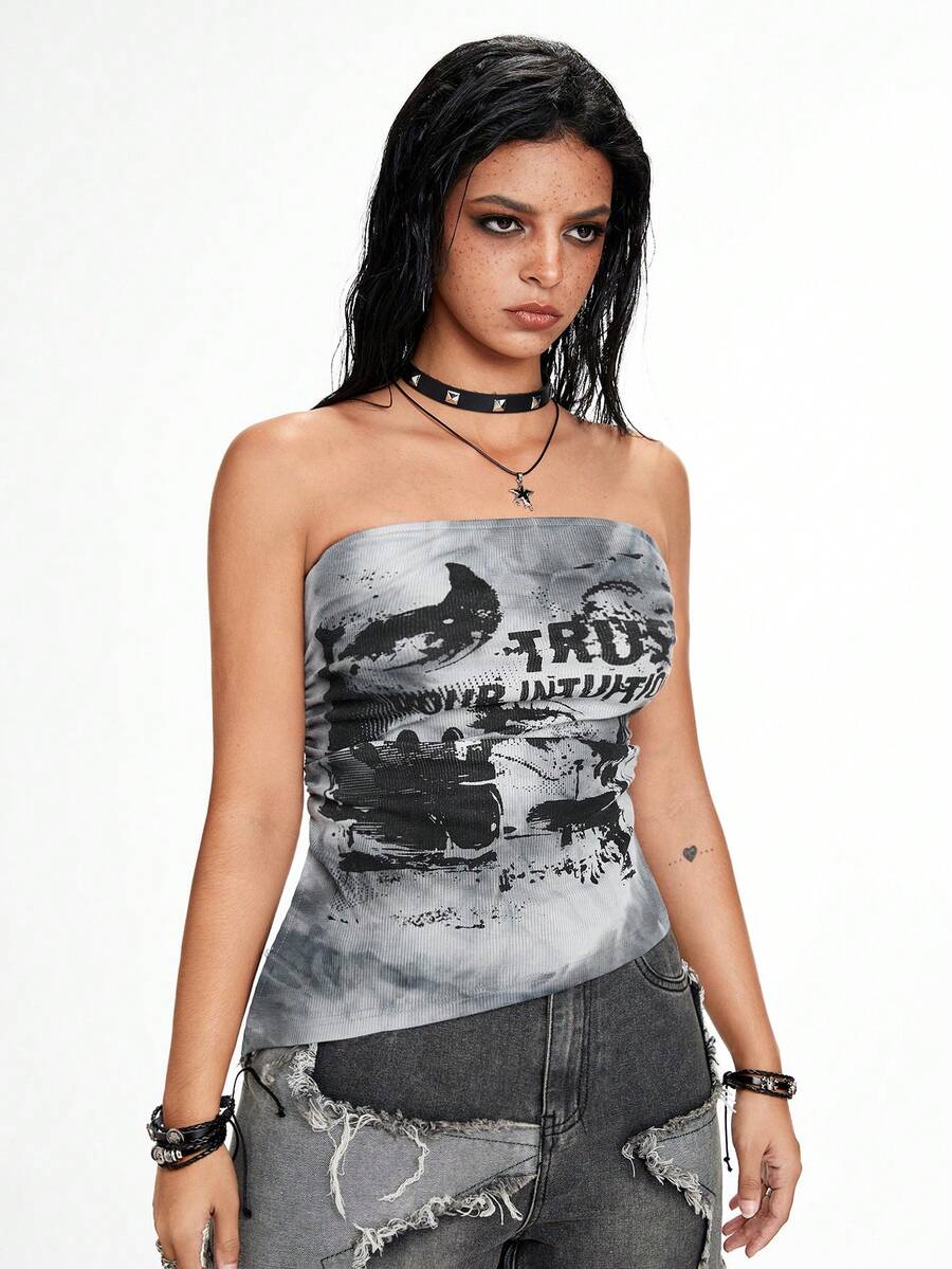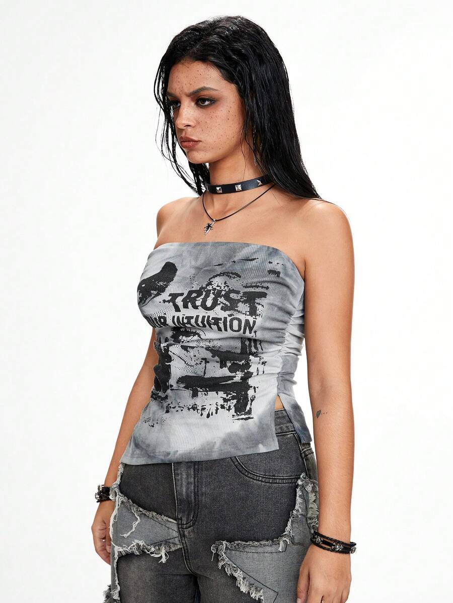Grunge Punk Top tubo ajustado corto con estampado de ojo en tie-dye negro y gris, bajo asimétrico, estilo punk del páramo