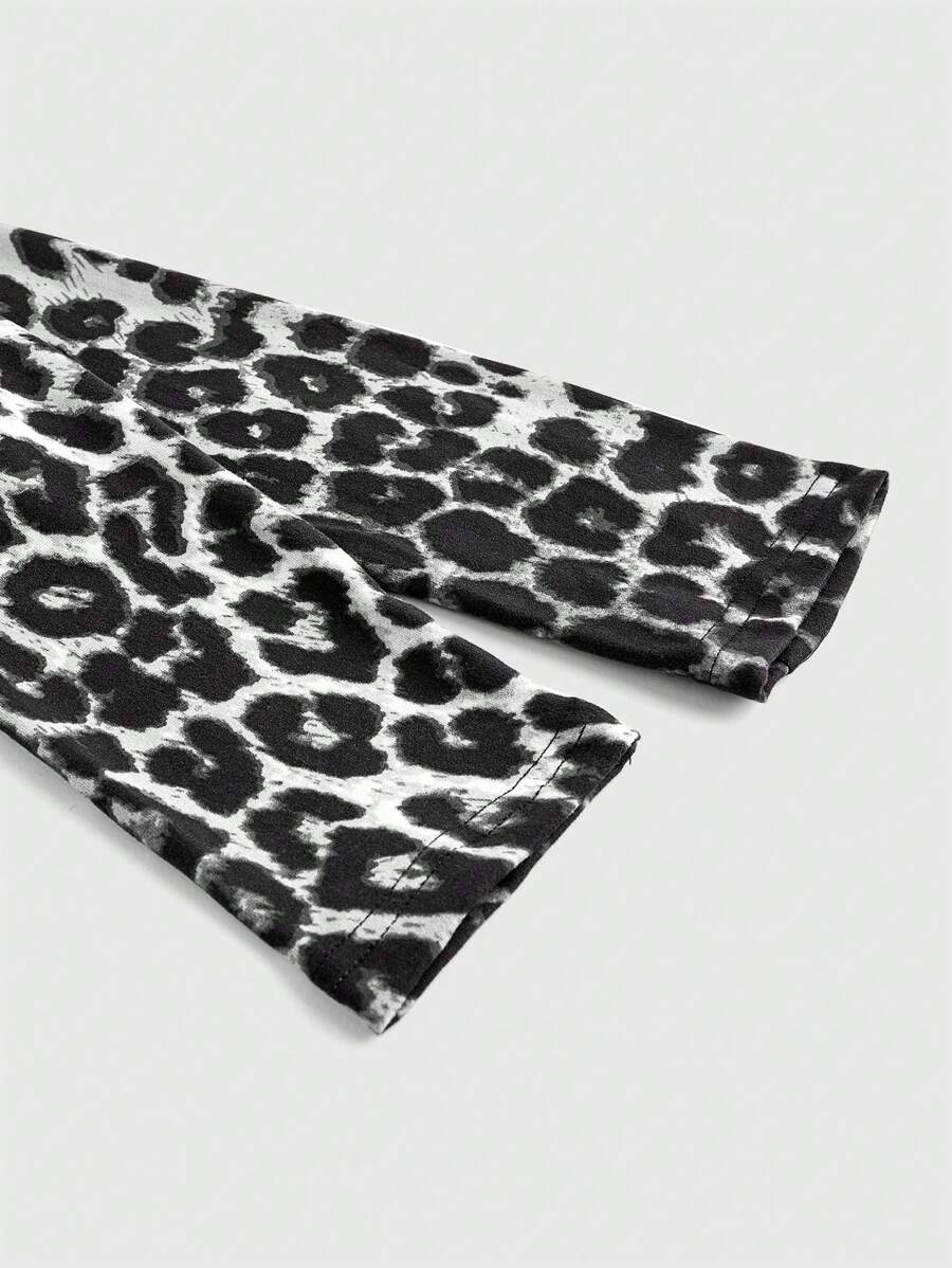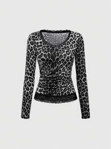 Grunge Punk Camiseta casual ajustada con encaje y estampado de guepardo para mujeres