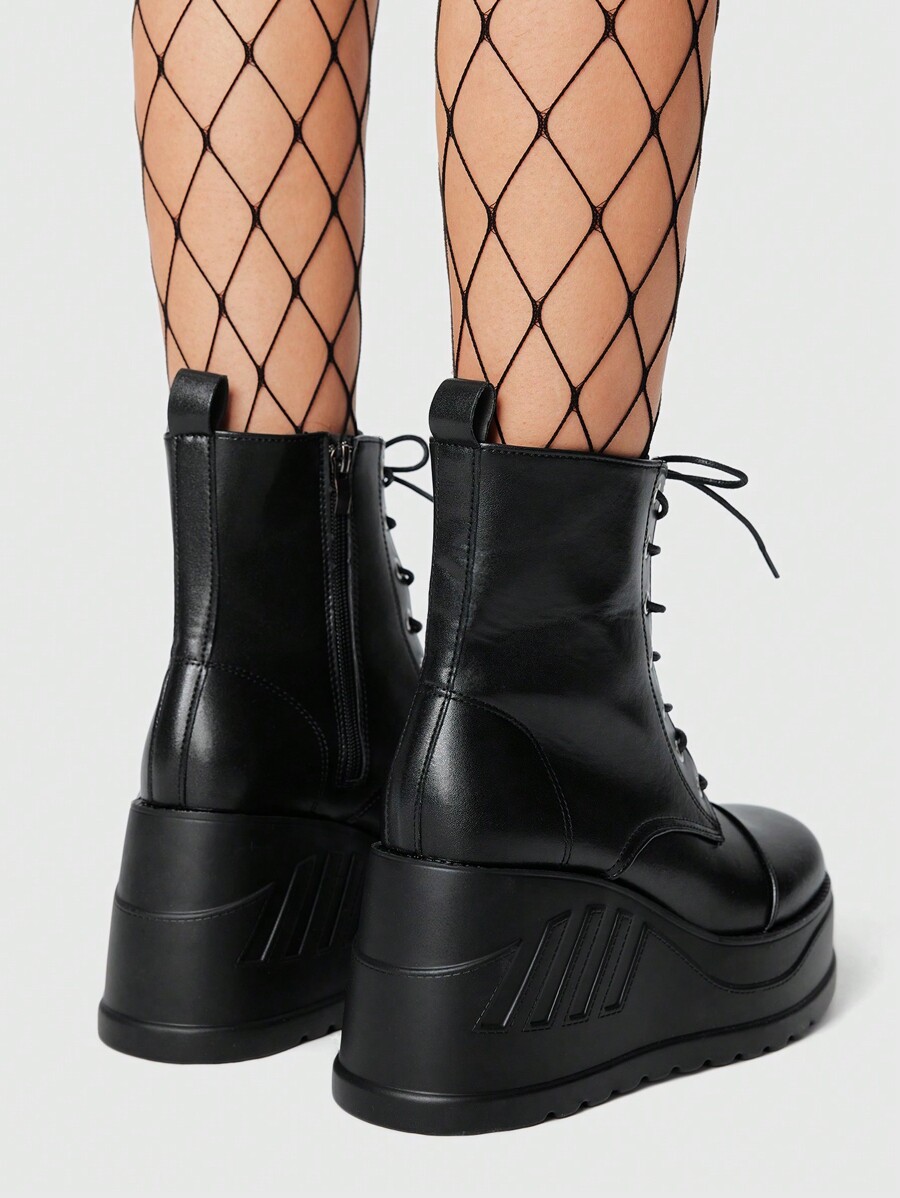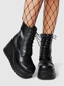 Grunge Punk Botines cortos de plataforma con punta redonda y cordones de mujer, de piel de poliuretano con acabado oscuro y estilo punk, de estilo casual punk para el campus