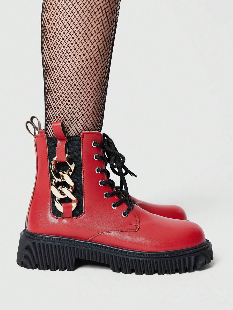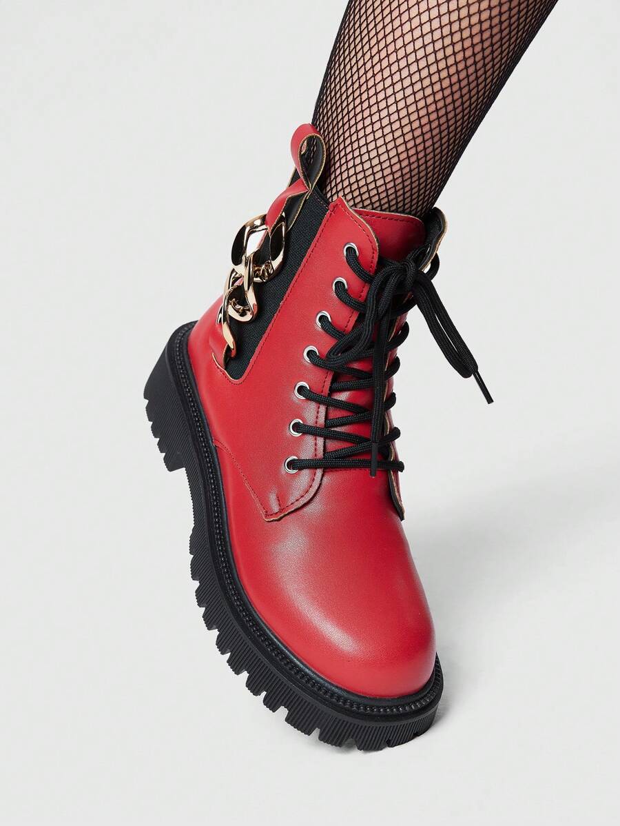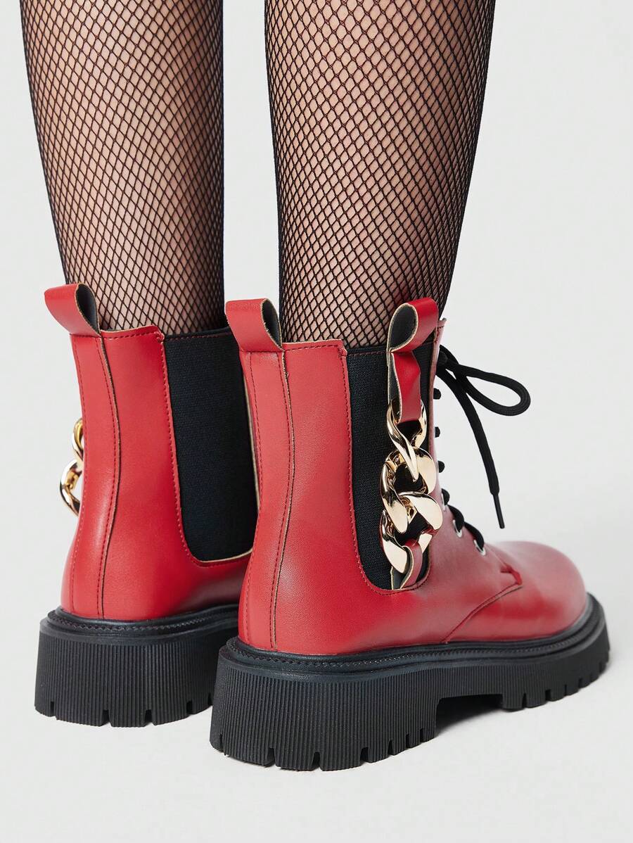 Grunge Punk Botas de tobillo y botas cortas de mujer con cadena decorativa de color contrastante para dar un toque navideño y de Año Nuevo, para otoño e invierno