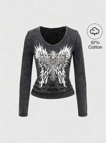 Grunge Punk Camiseta ajustada con apliques de cruz y alas con incrustaciones de rhinestones para mujer