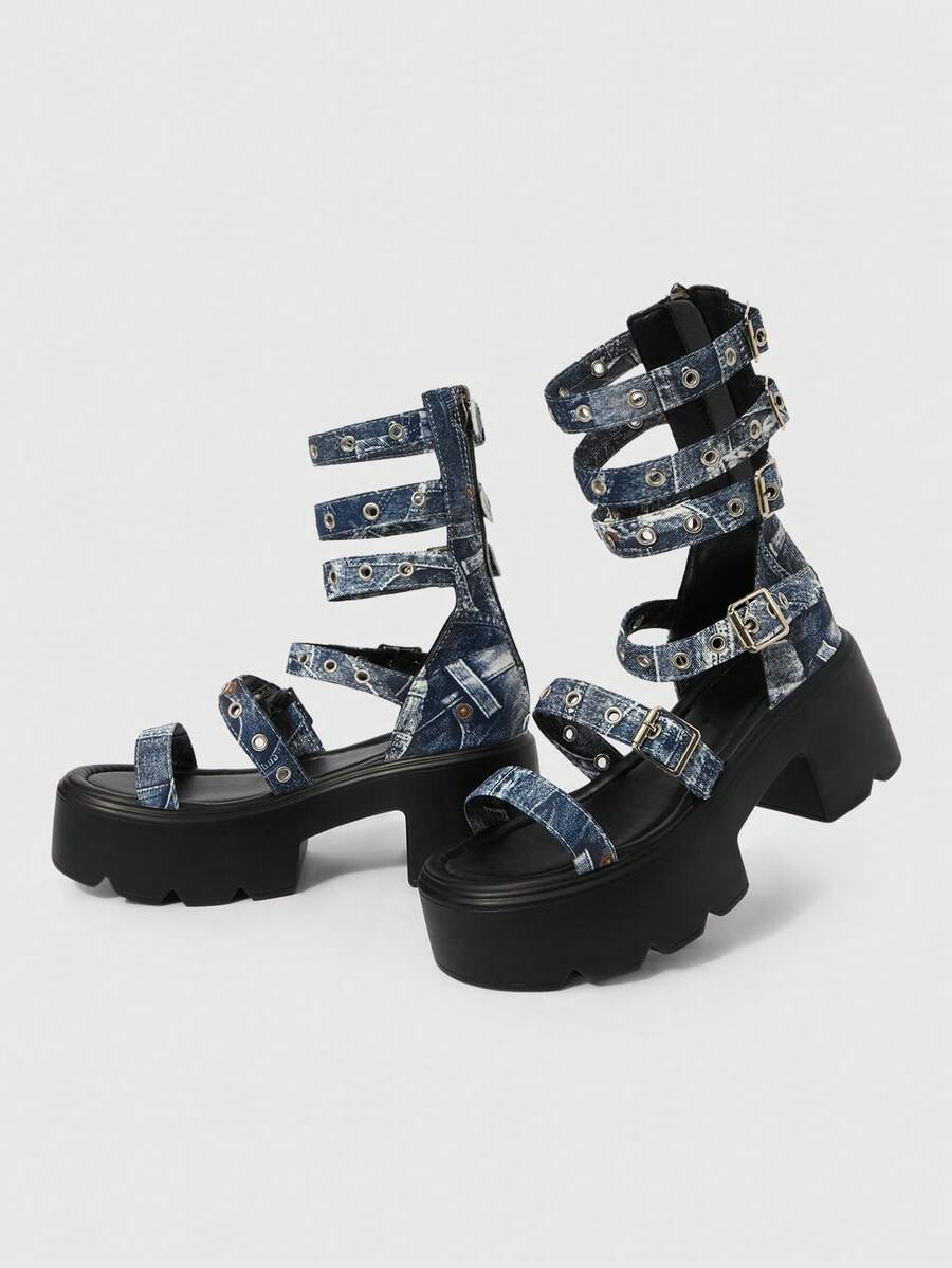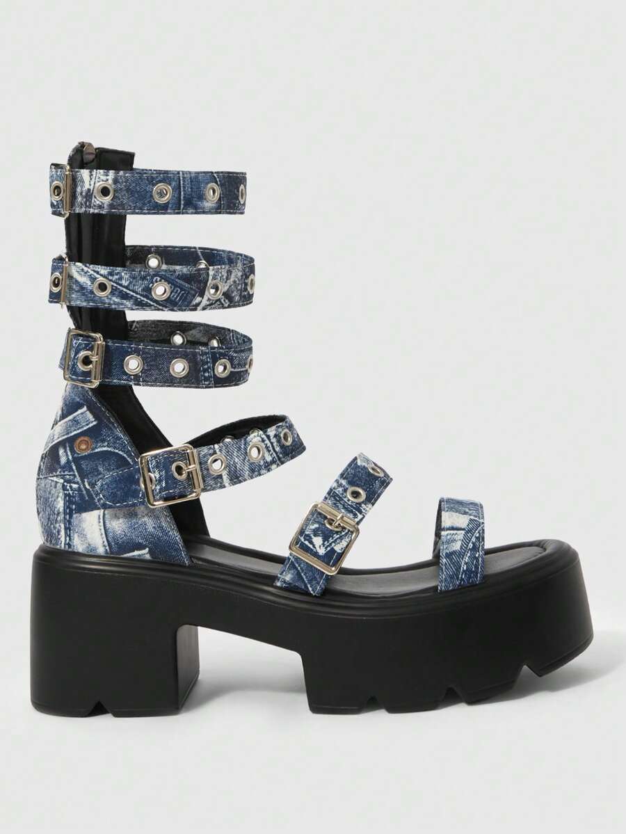 Grunge Punk Sandalias de plataforma góticas, de rock y punk para mujer, con tiras de cuero de punta abierta, tacón alto grueso, para vestidos de verano y Halloween