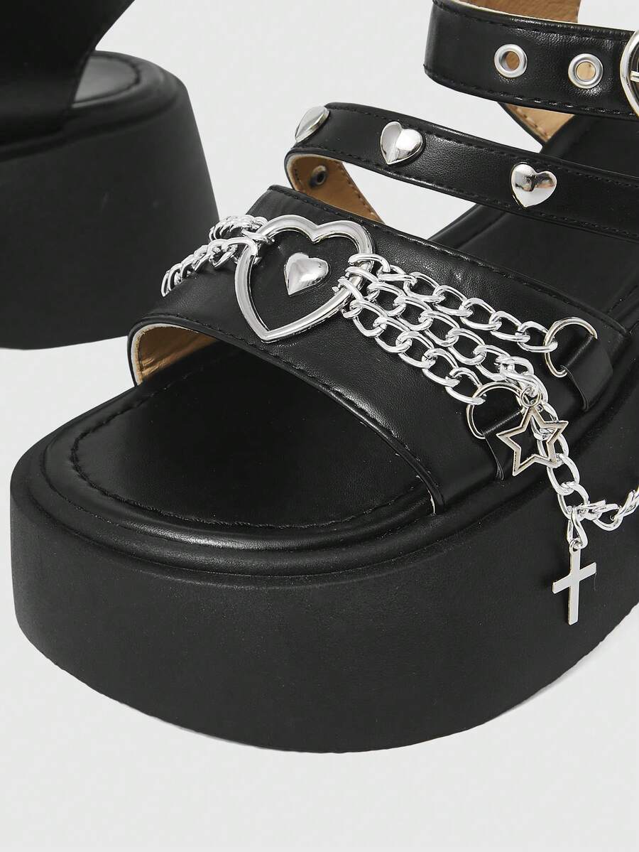 Grunge Punk Sandalias romanas huecas de mujer con decoración de cadena con hebilla con forma de corazón, diseño de plataforma de 6.5 cm, PU negro, de moda para fiesta, citas y uso diario
