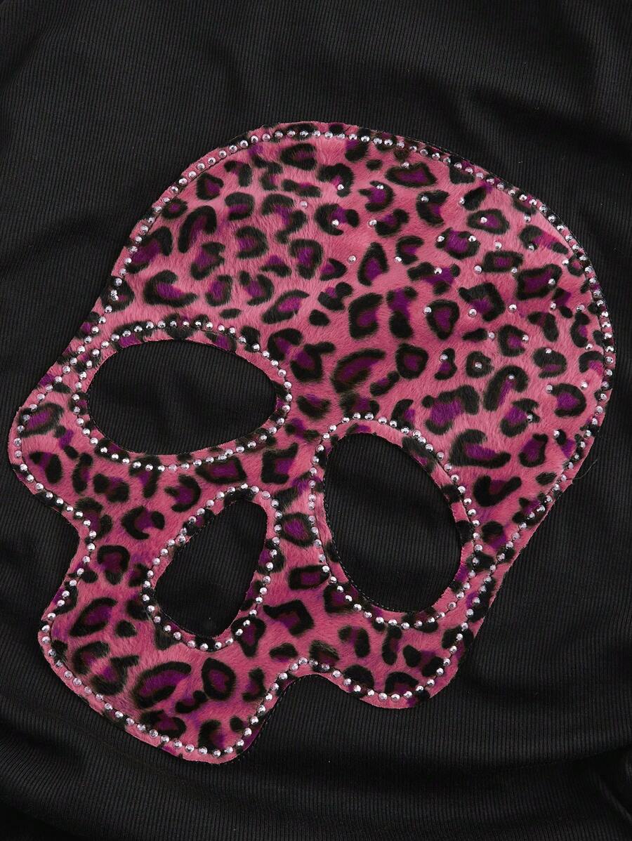 Grunge Punk Camiseta ajustada con cuello asimétrico, estampado de leopardo y calavera, estilo Gyaru Kpop sexy para mujer