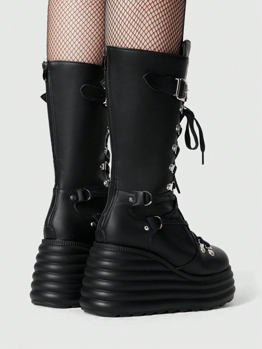Grunge Punk Botas de media caña con plataforma, puntera redonda, cordones y suela gruesa de estilo punk oscuro para uso diario, de estilo punk y campus