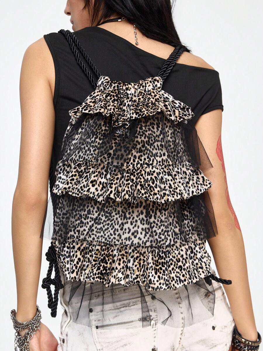 Grunge Punk Mochila con cordón con volantes y estampado de leopardo de gran capacidad y elegante para mujer