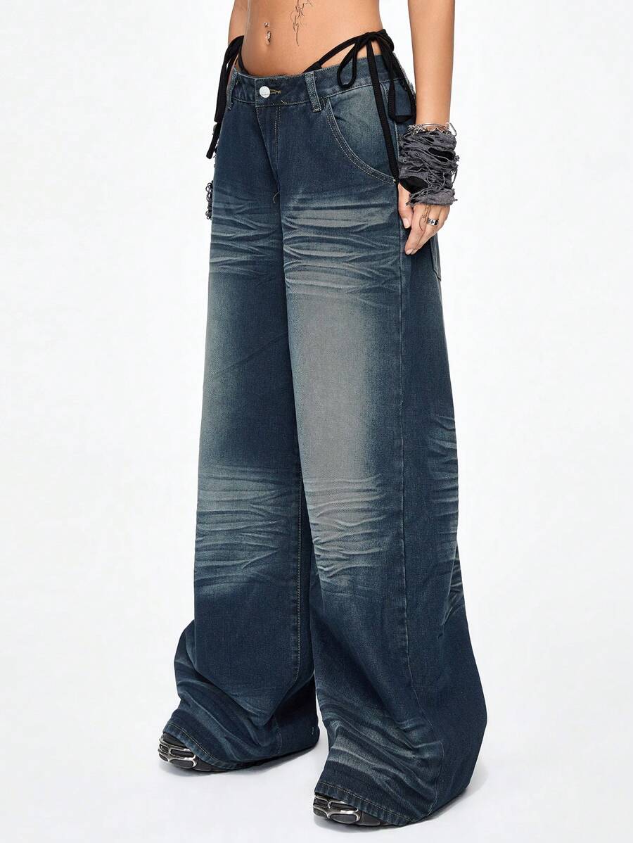 Grunge Punk Jeans tipo novio con bolsillo bordado en la parte trasera y ajuste oversize para mujer