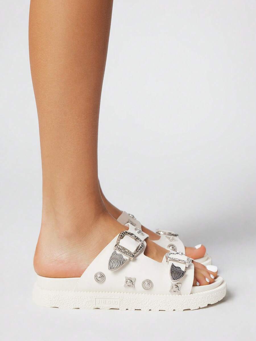 Grunge Punk Sandalias de punta abierta punks oscuras para mujer, zapatos de playa romanos de verano con hebilla metálica, sandalias planas blancas tipo slip-on