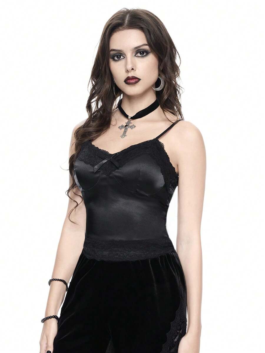 Grunge Punk Top casual sencillo de mujer de un solo color con tirantes finos y decoración de lazo, apto para uso diario