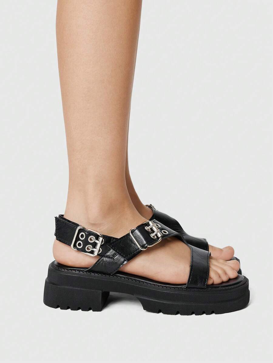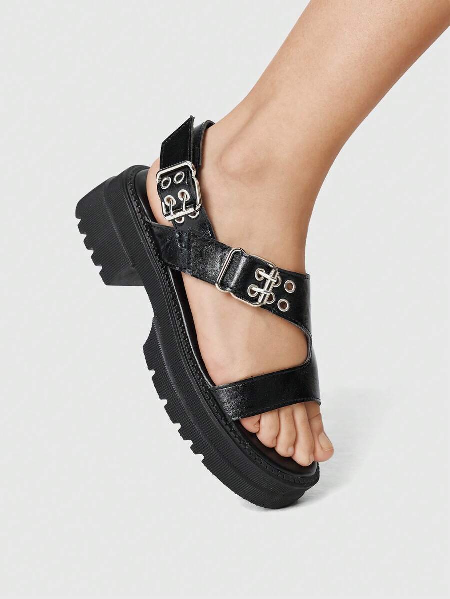Grunge Punk Sandalias de verano para mujer con correa con hebilla, de estilo romano gótico oscuro y punk en la playa, con plataforma y tacón de cuña