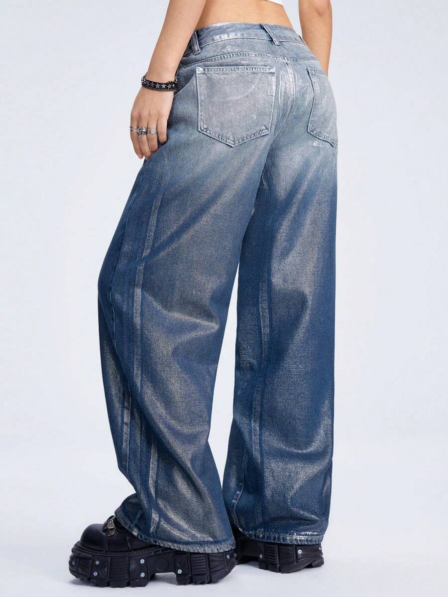 Grunge Punk Jeans Acampanados, Sueltos, Lavados Con Agua Plateada Con Diseño De Moda Estilo Y2k Para Mujeres