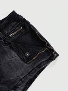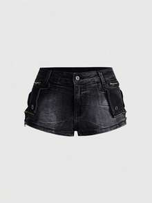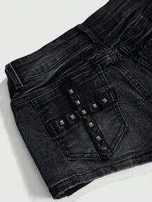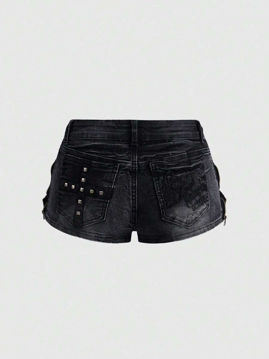 Grunge Punk Shorts vaqueros de tiro súper bajo para mujer con bordado de calavera y decoración de remaches, estilo Y2K Baddie