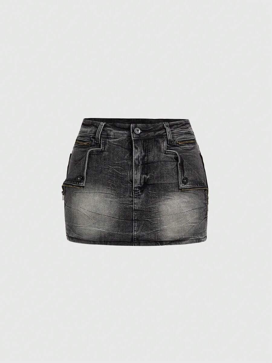 Grunge Punk Minifalda de mezclilla de tiro ultra bajo para mujer con bordado de calavera y decoración de remaches, estilo Y2K Baddie