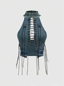 Grunge Punk Top sin mangas de cuello alto con diseño de amarre delantero en denim, para festival de música punk rock Y2K