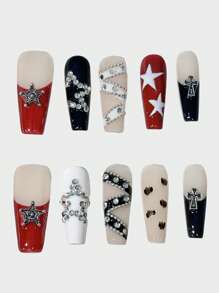 Grunge Punk Uñas postizas hechas a mano con estilo punk Y2K, con decoraciones en negro y rojo de estilo occidental, francés, estrellas metálicas, cruces y corazones 3D, ideal para la fotografía de moda urbana