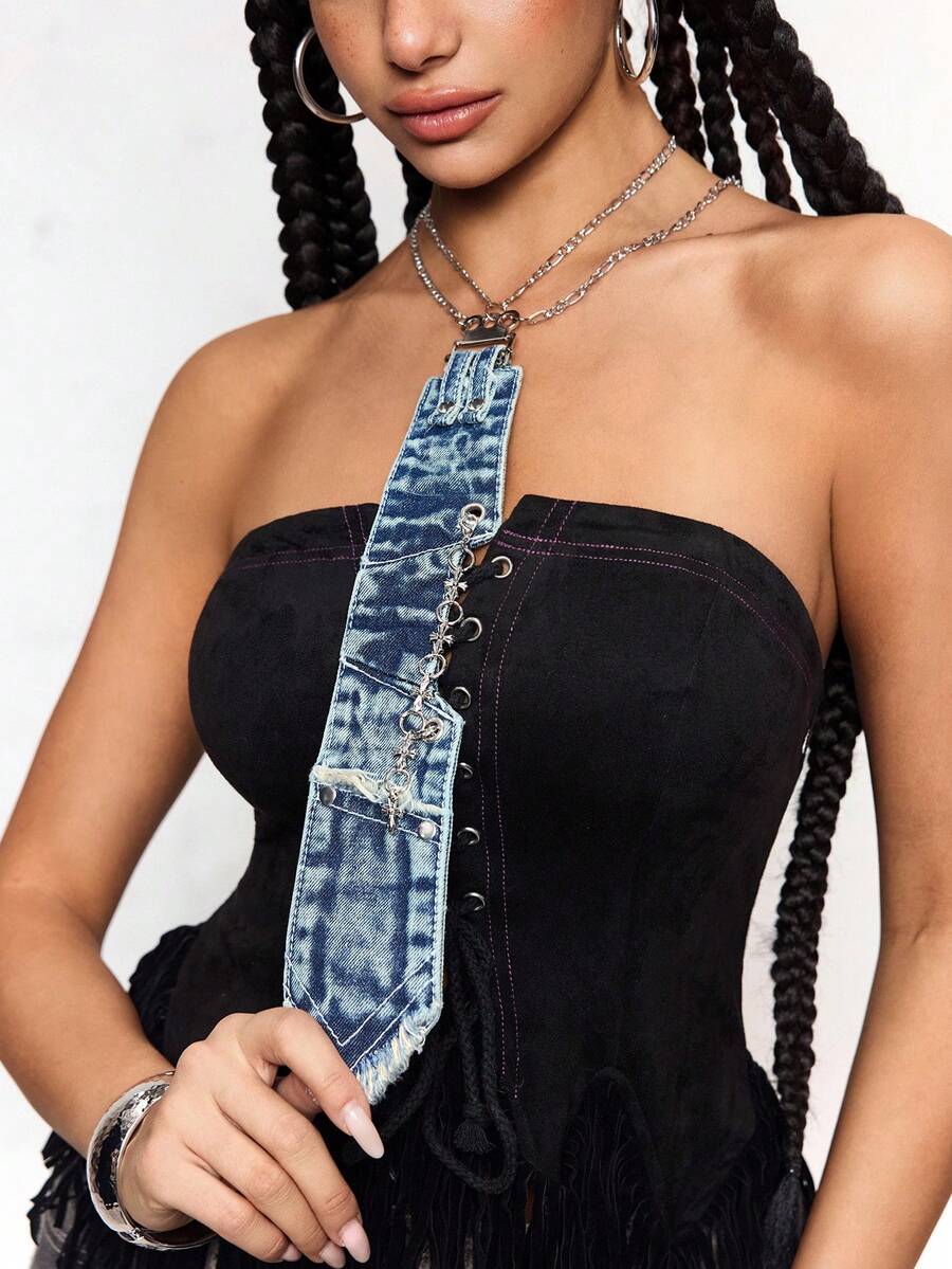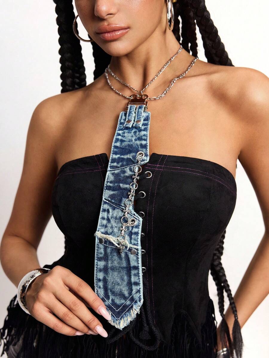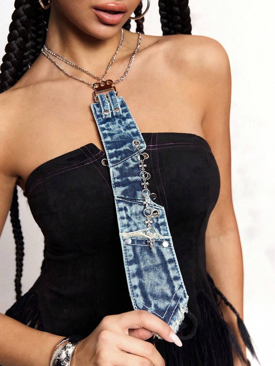 Grunge Punk Anillo de metal con decoración estilo punk Y2K, corbata de mujer desgastada con múltiples ojales y bolsillos, accesorio de diseño único y atrevido