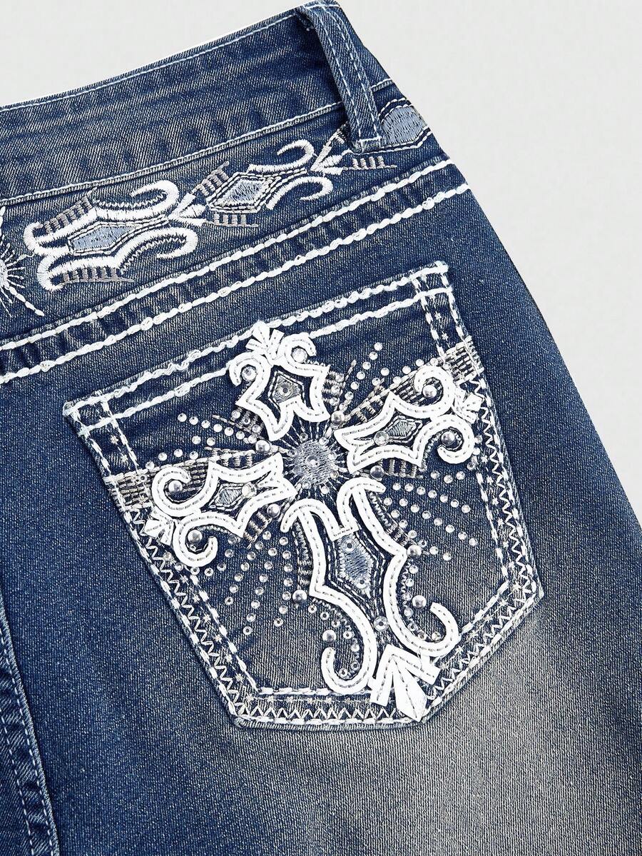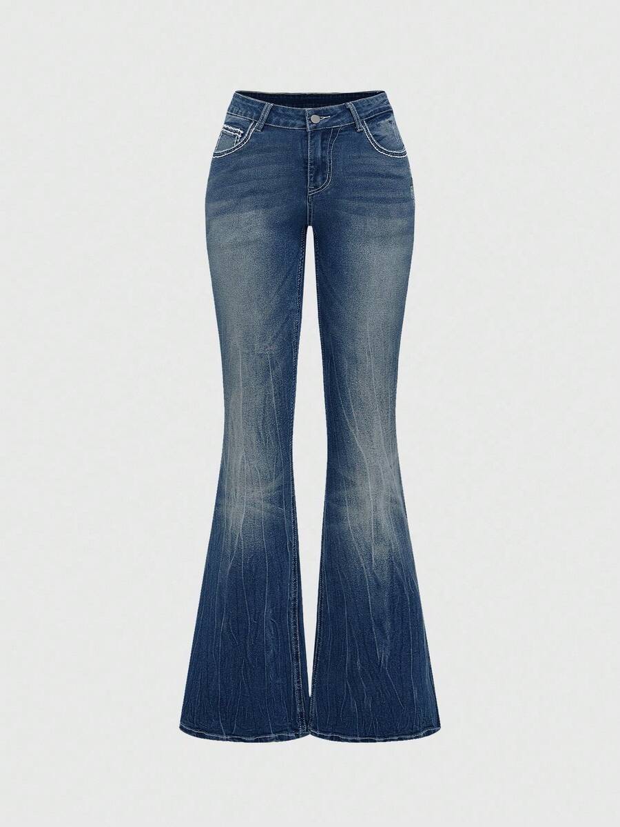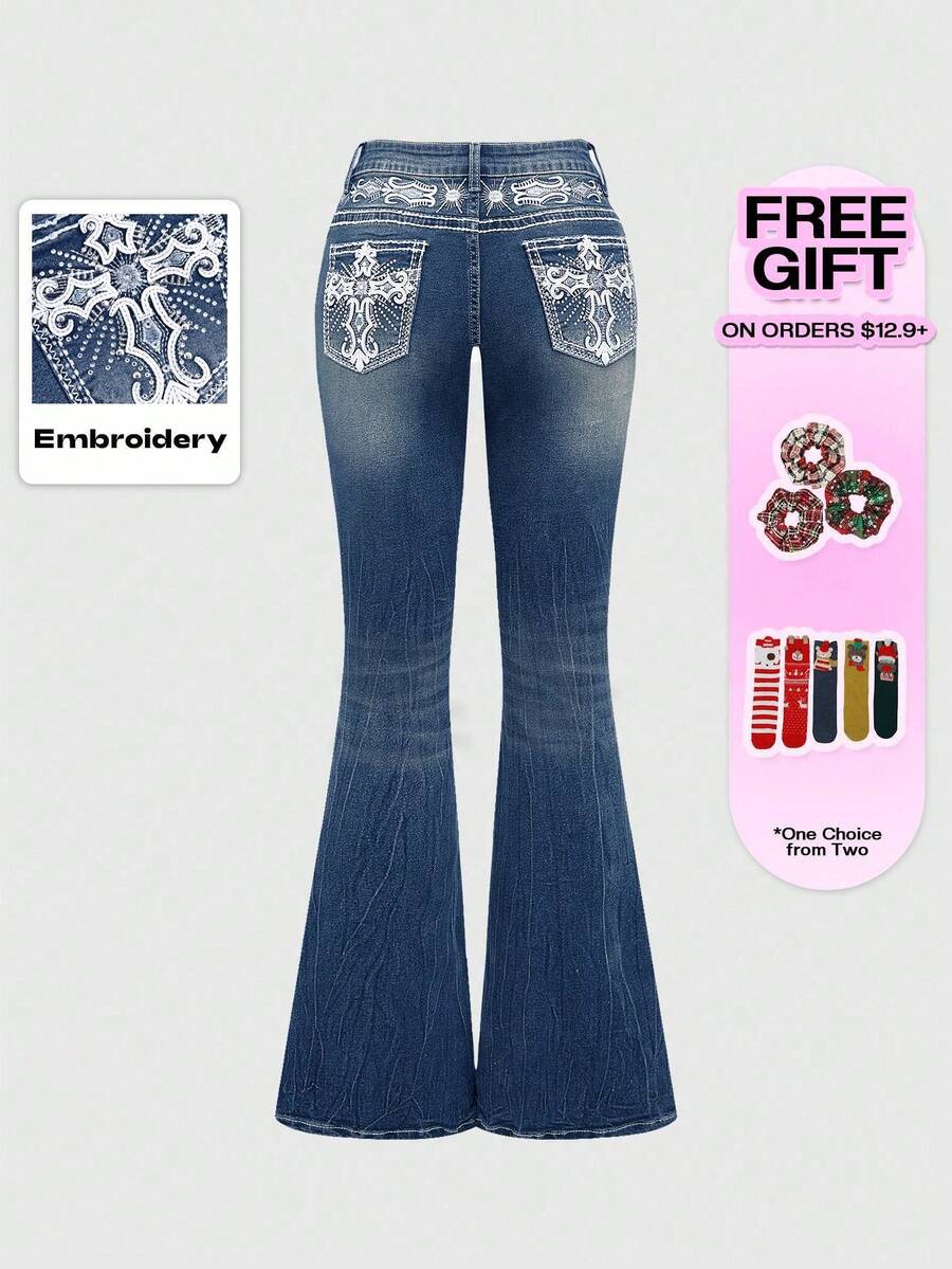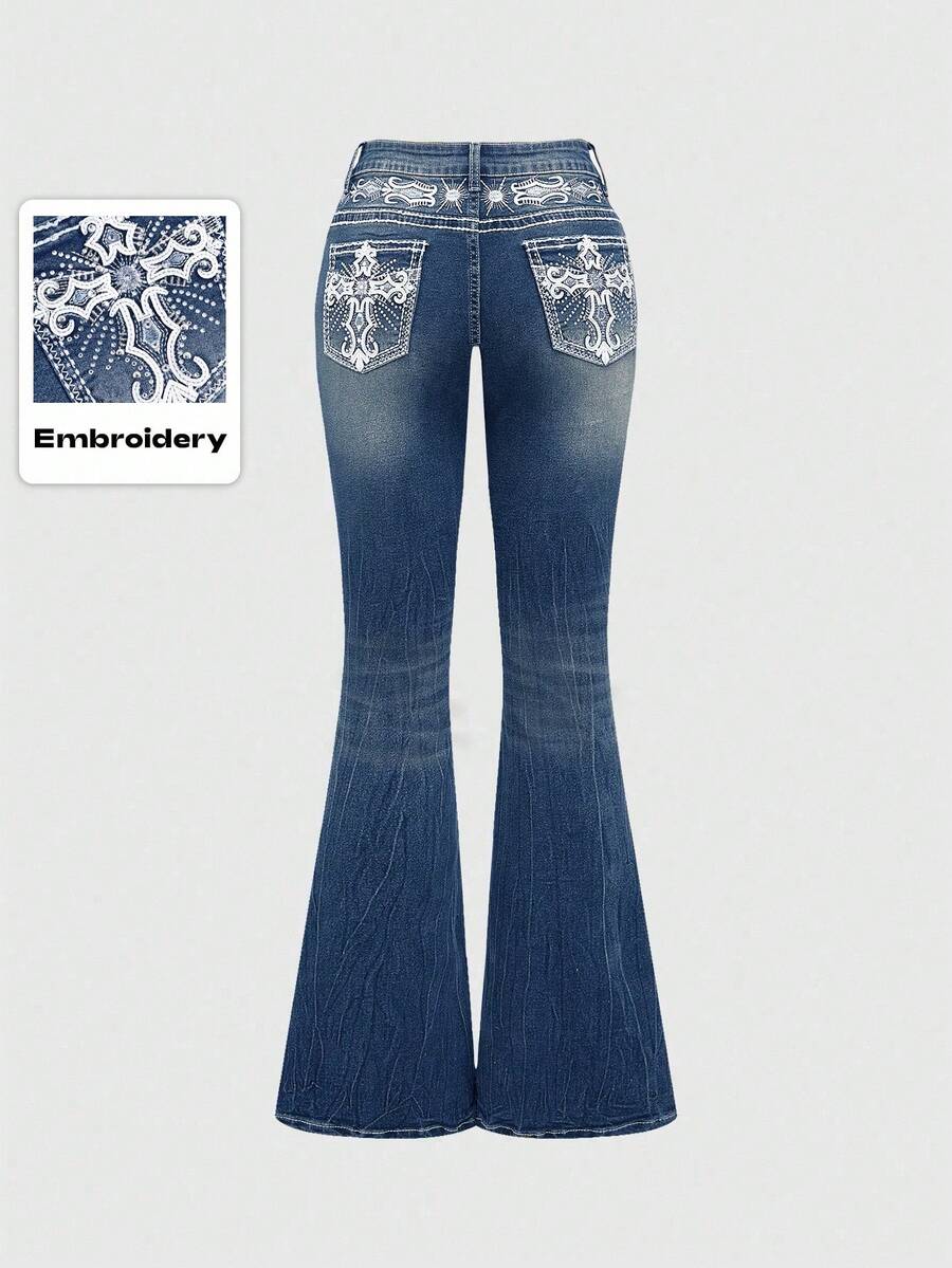 Grunge Punk Jeans ajustados para mujer con pierna acampanada, bolsillo, bordado de alas cruzadas y que deja ver el ombligo, con estilo retro Y2K