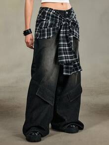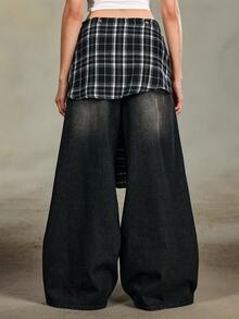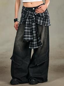 Grunge Punk Jeans de mujer con pierna acampanada a cuadros en estilo retro Y2K