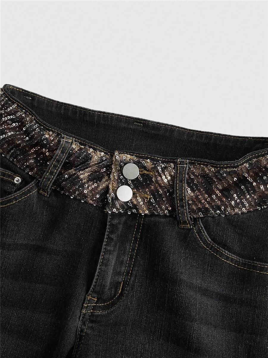 Grunge Punk Pantalones vaqueros acampanados de ajuste ceñido con alas de lentejuelas de leopardo, decoración de strass, estilo retro y sexy Y2K para mujeres