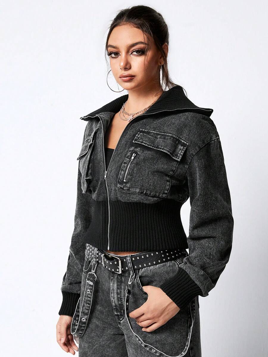 Grunge Punk Chaqueta de mezclilla sobredimensionada con acento de bolsillo 3D arruinado estilo Y2K