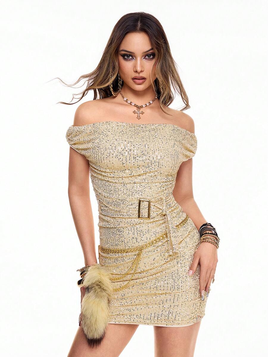 Grunge Punk Vestido mini ajustado con cuello asimétrico y lentejuelas para mujer, atuendo de concierto
