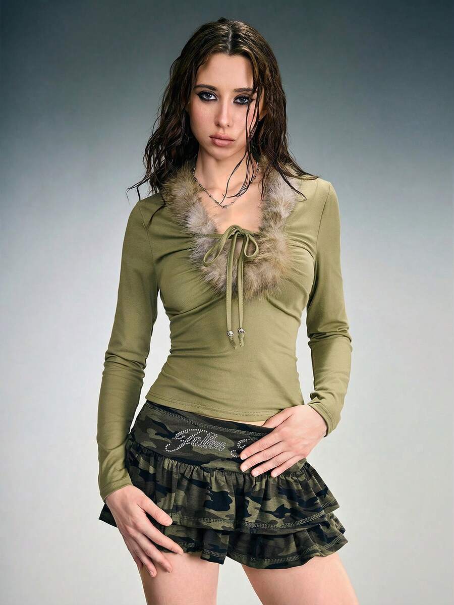 Grunge Punk Top corto sexy con borde de peluche y escote en V profundo, ajuste ceñido