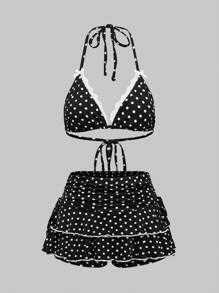 Grunge Punk Conjunto de 2 piezas con top triángulo estampado con lunares y falda corta súper arrugada de cintura baja al estilo vacacional Y2K sexy