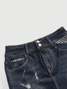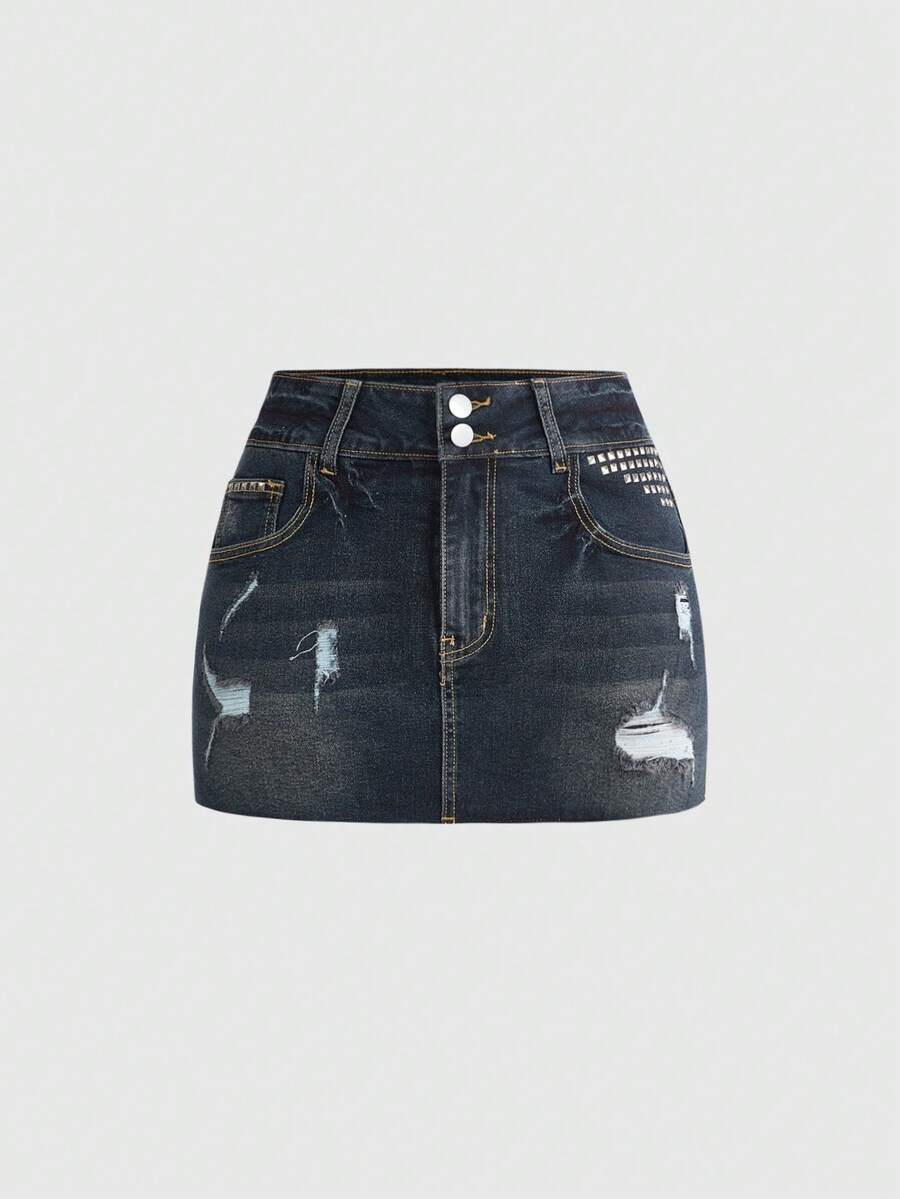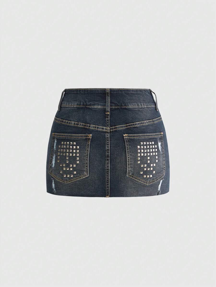 Grunge Punk Minifalda de mezclilla distressed con remaches y calavera, estilo sexy y punk para mujeres