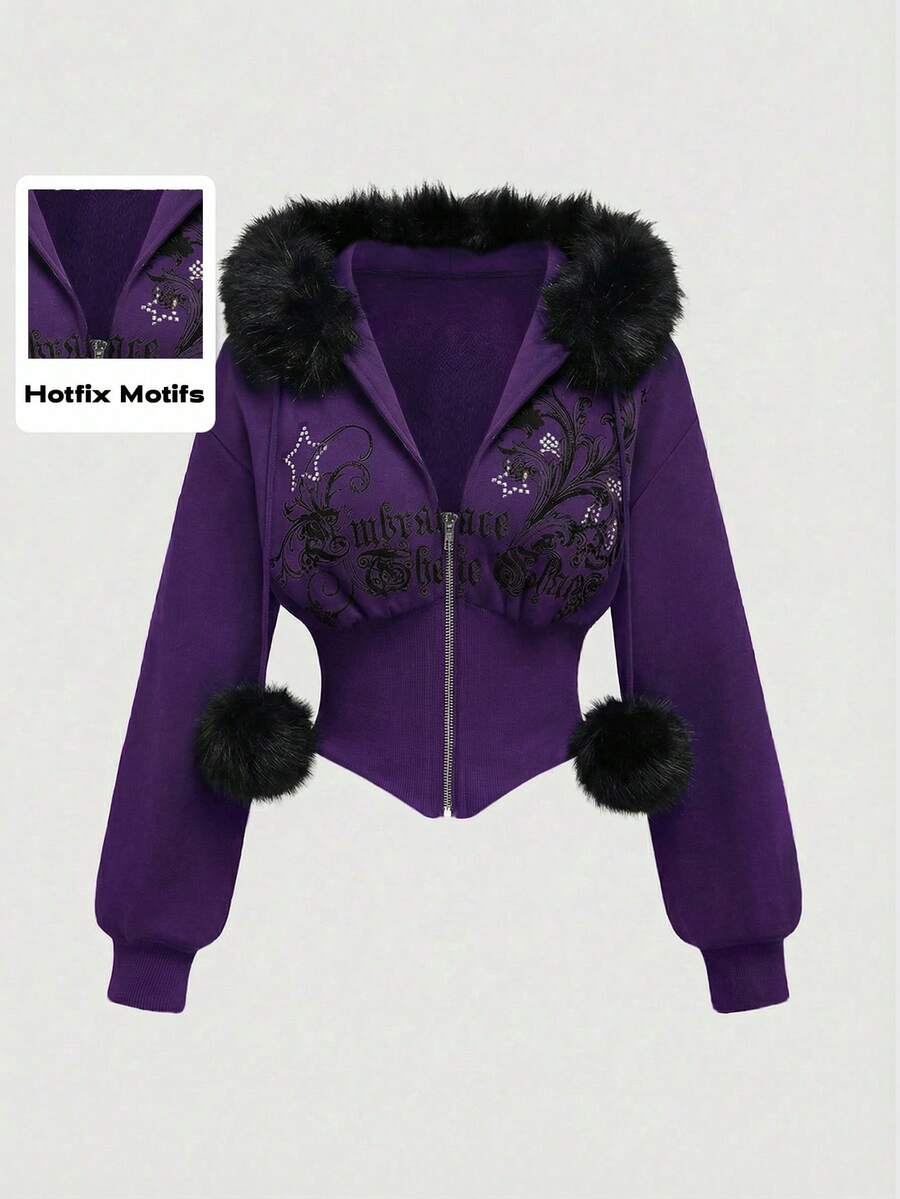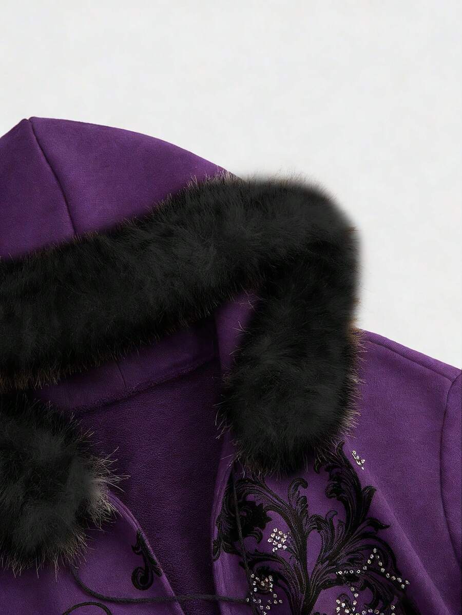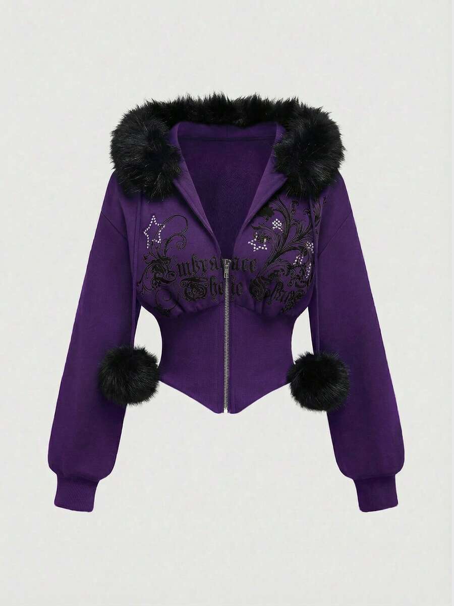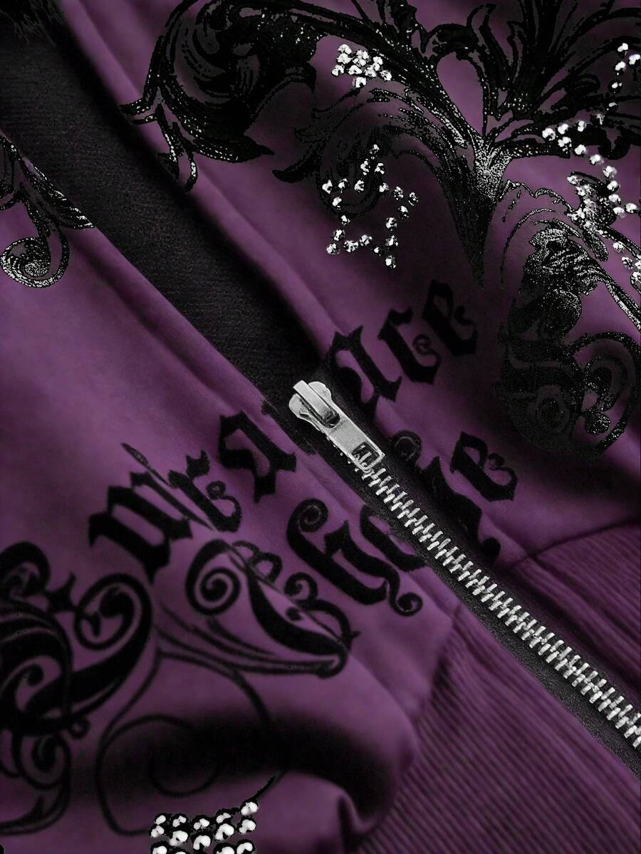 Grunge Punk Sudadera con capucha con estampado de leopardo ajustada de subcultura Y2K con estampado floral vintage y decoración de rhinestones para mujeres