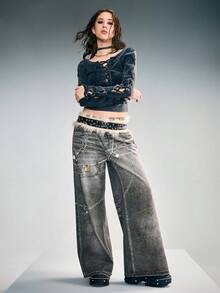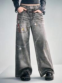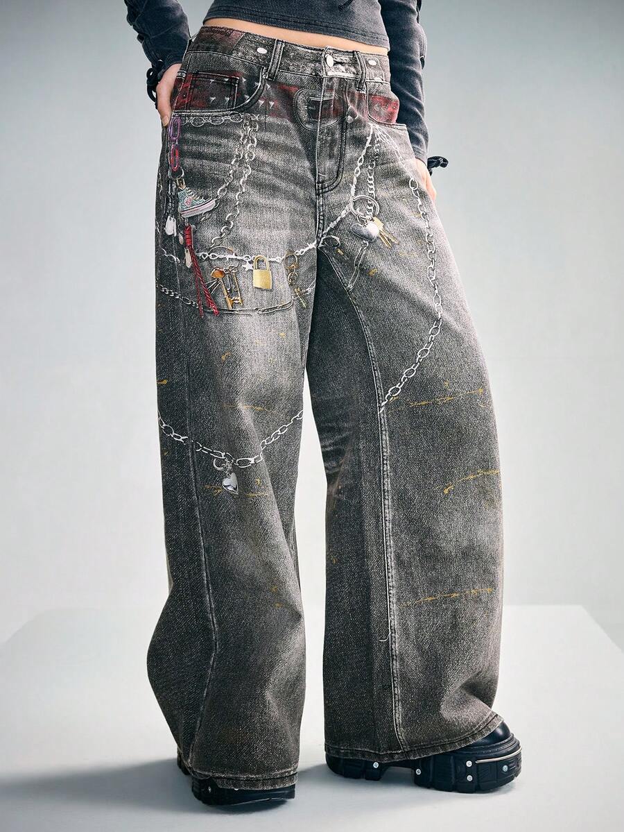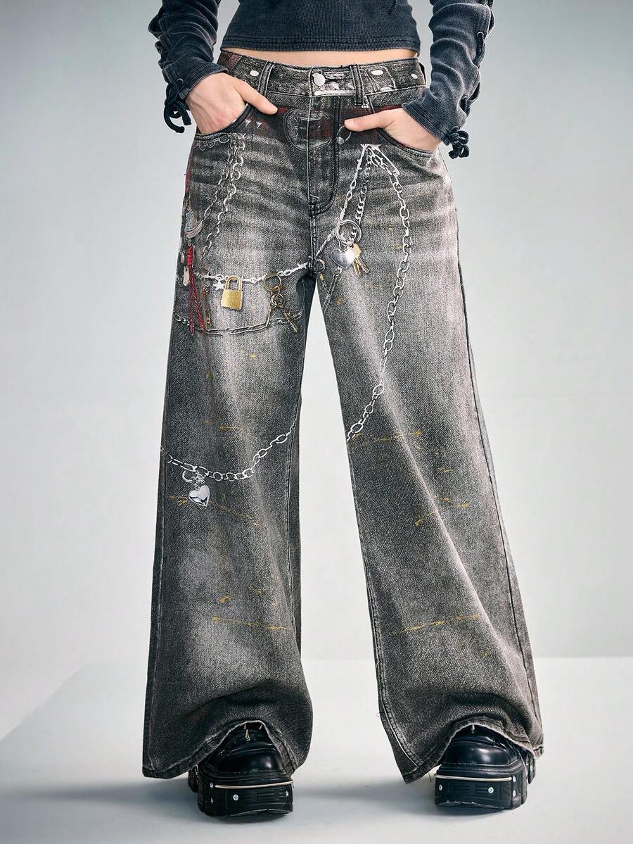 Grunge Punk Jeans de pierna ancha y suelta con estampado de cadena vintage Y2K para mujeres