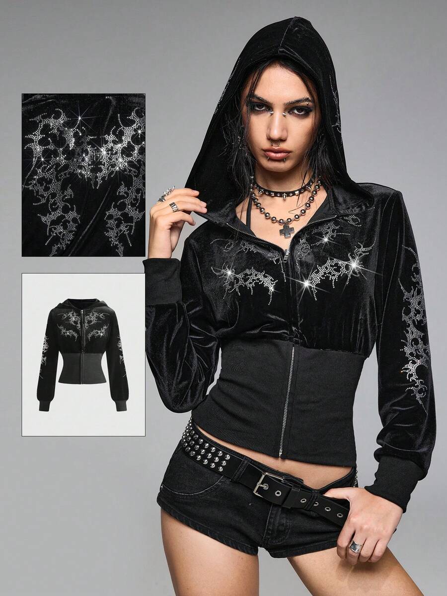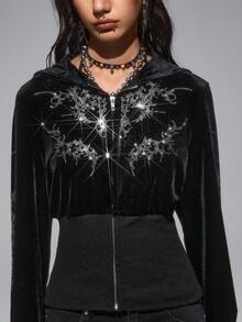 Grunge Punk Sudadera con capucha con gráfico de espinas y alas, ajustada y con tachuelas, estilo vintage Y2K para mujeres