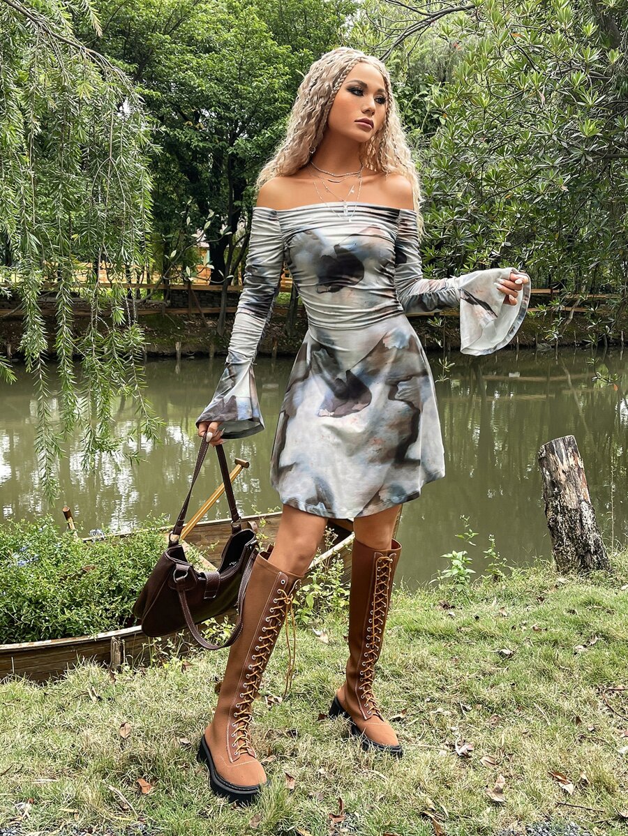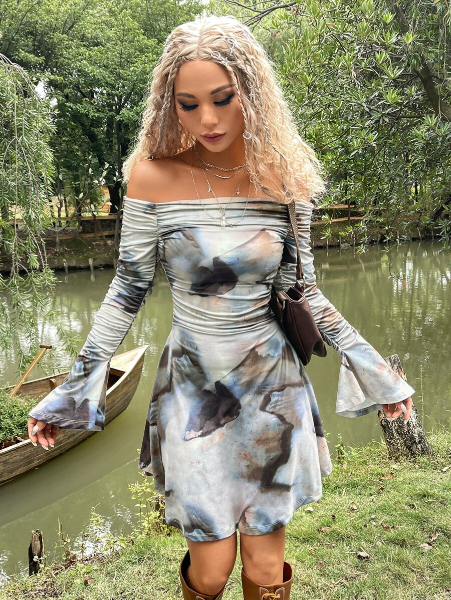 Vestido grunge de tie dye de hombros descubiertos de manga con volante fruncido