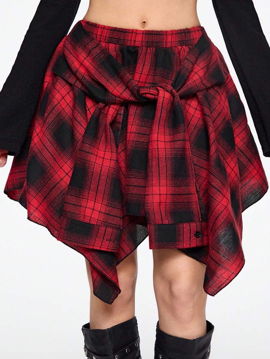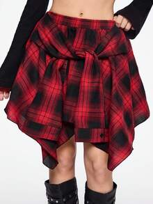 Grunge Punk Falda asimétrica con volantes, de talla grande, con cordones y estampado de cuadros vintage desgastado
