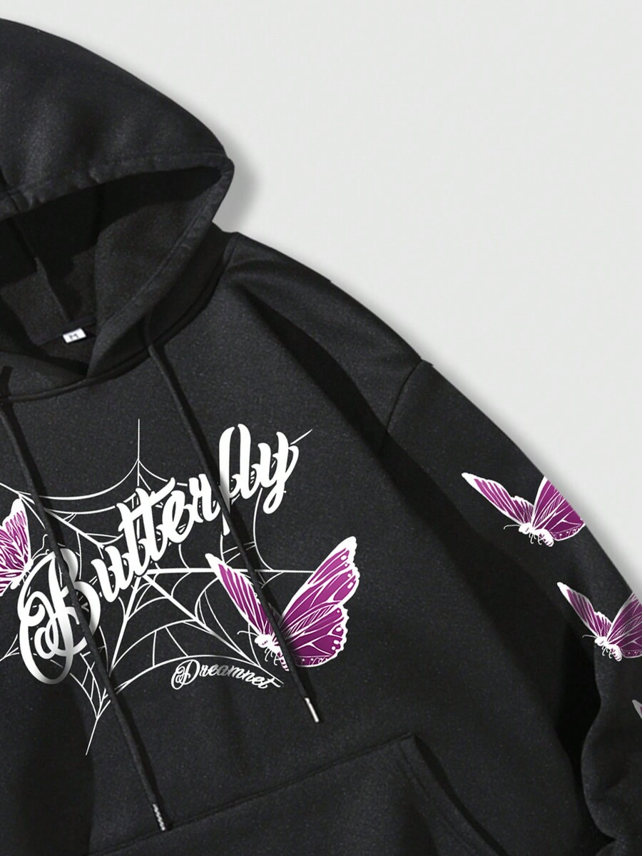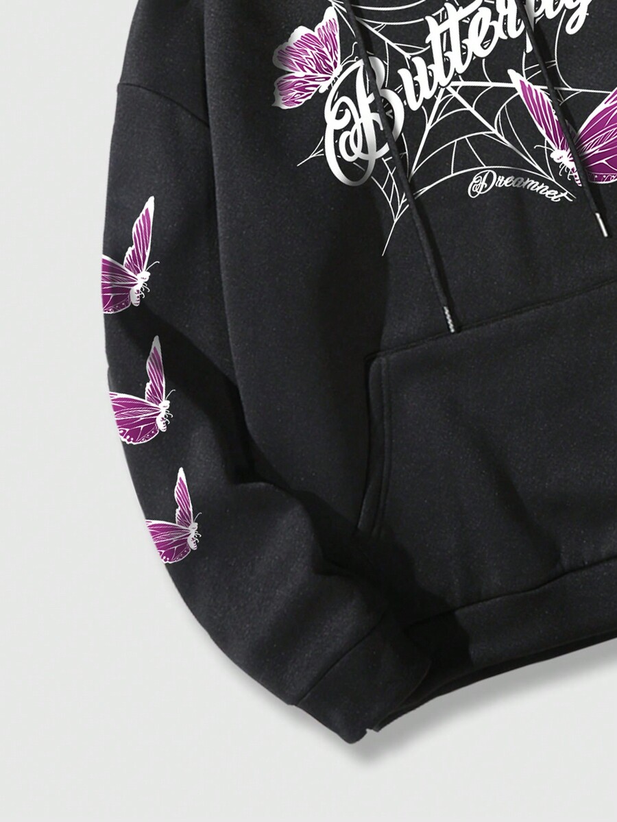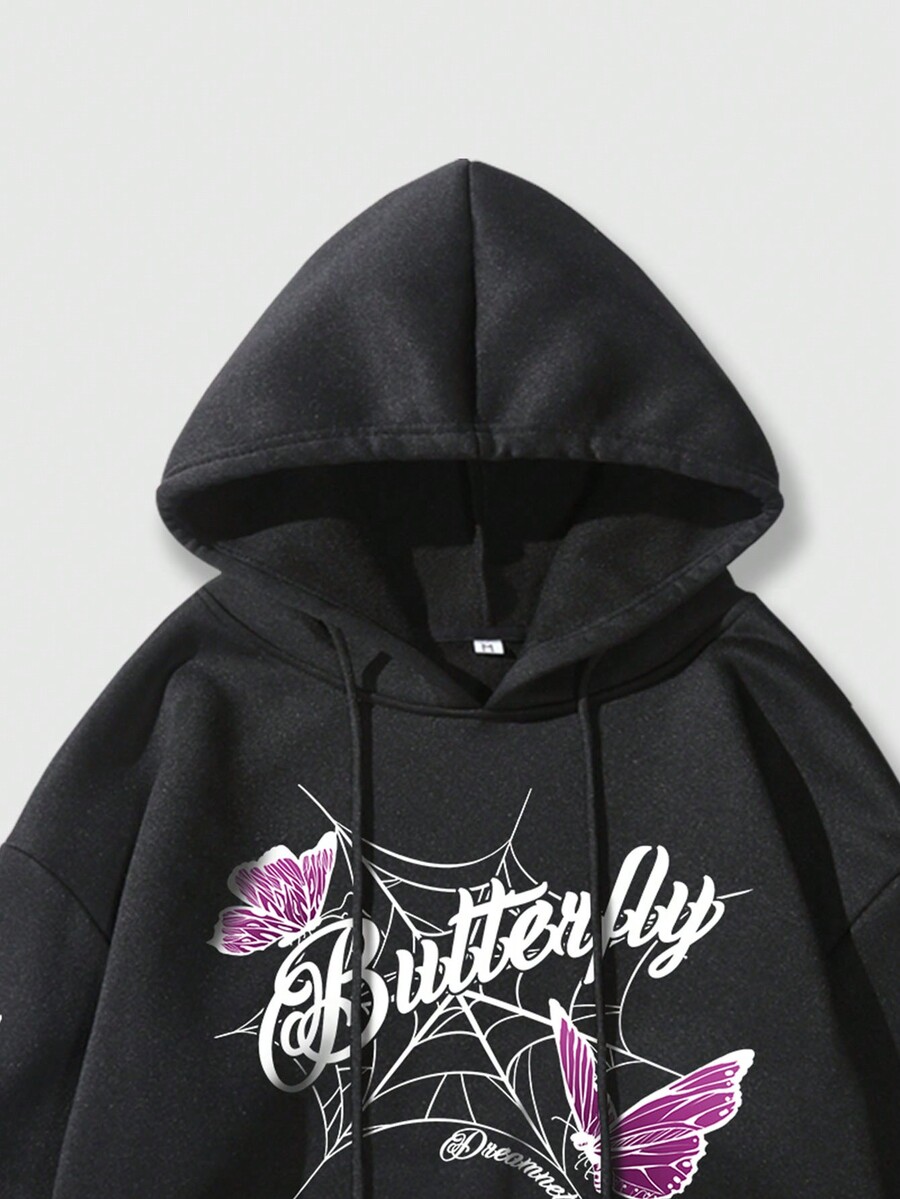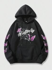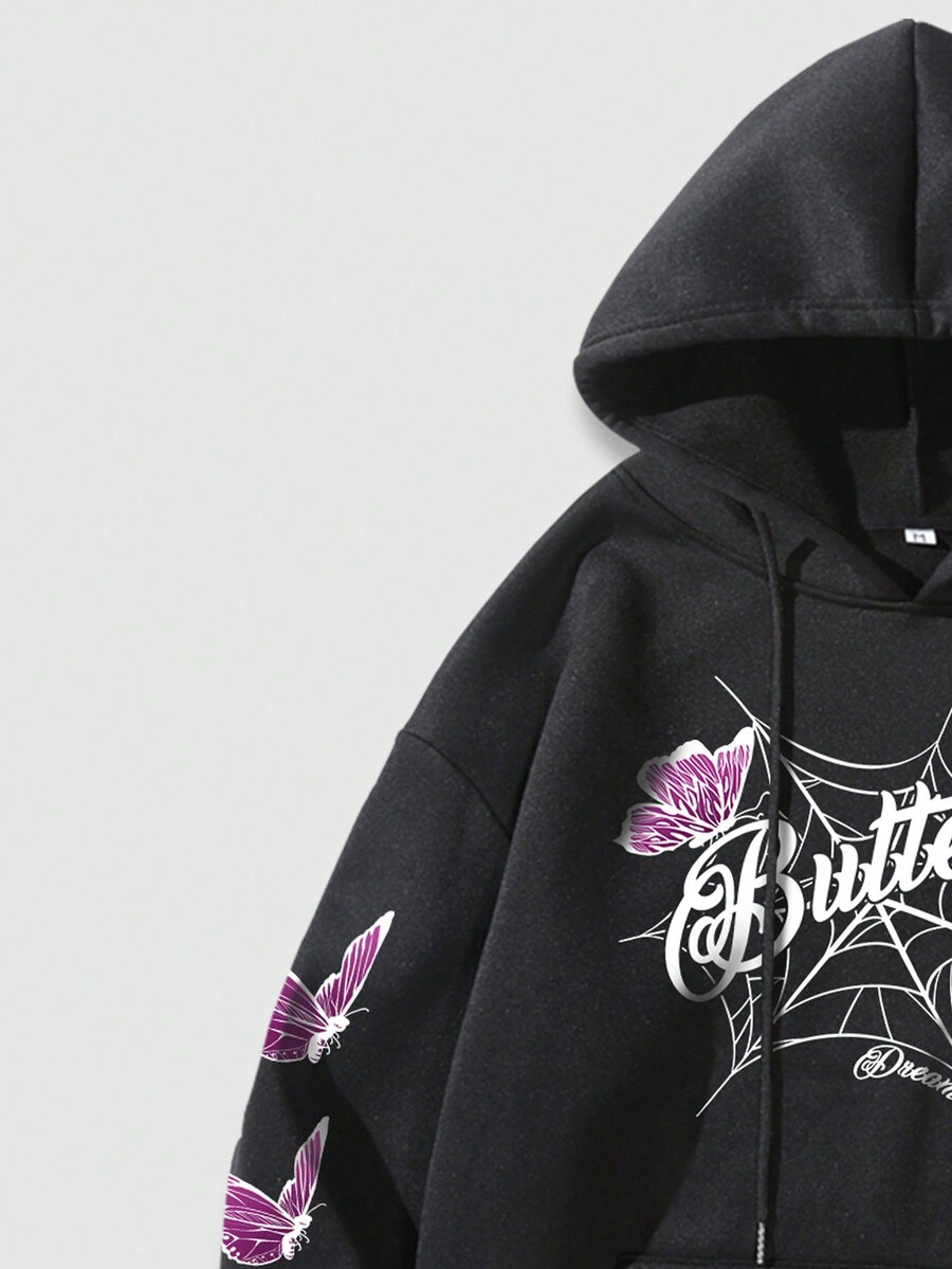 Street Life Hombres Capucha con estampado de mariposa y letra con bolsillo de canguro con cordón con forro térmico