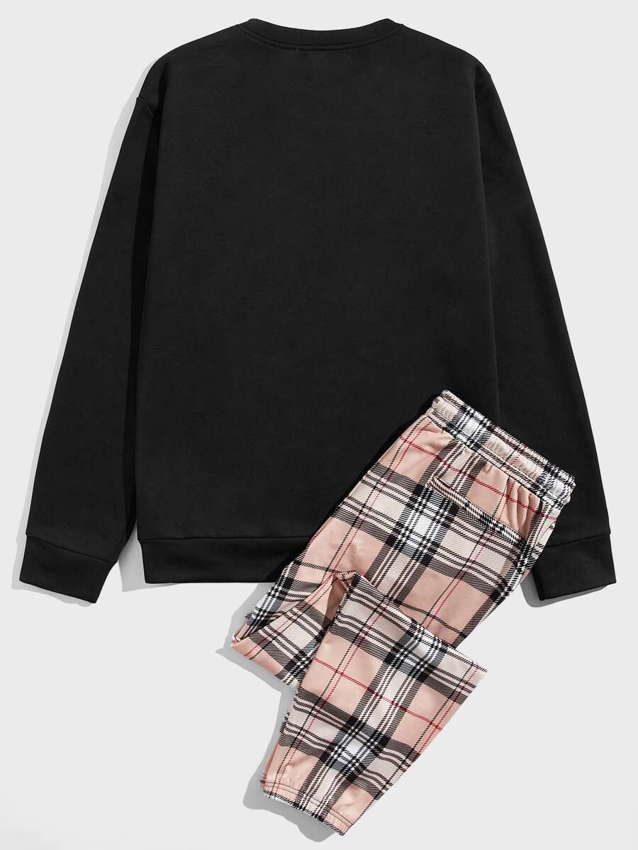 Hombres Sudadera con estampado de dibujos animados & Pantalones deportivos de cuadros de cintura con cordón