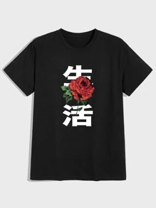 Hombres Camiseta letra china con estampado de rosa