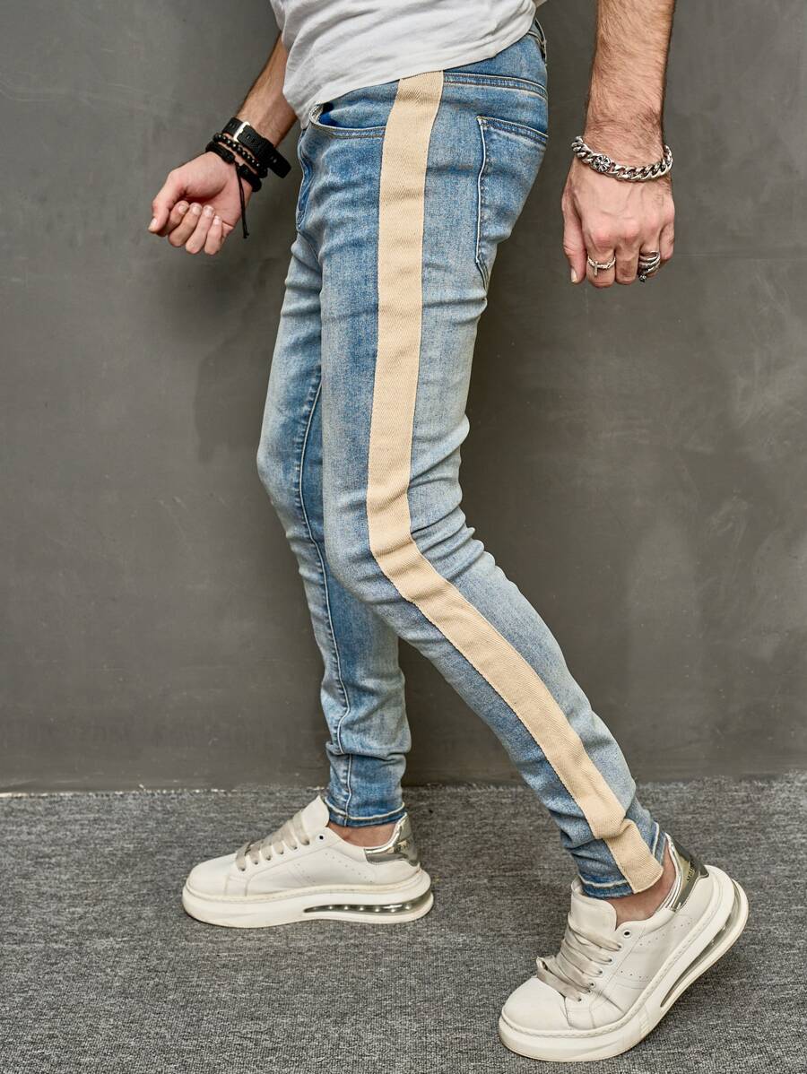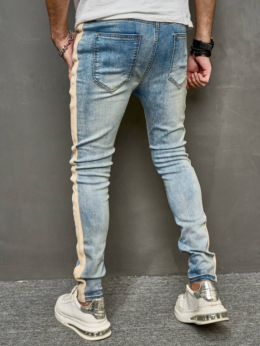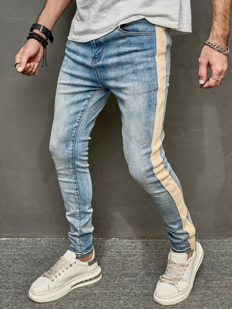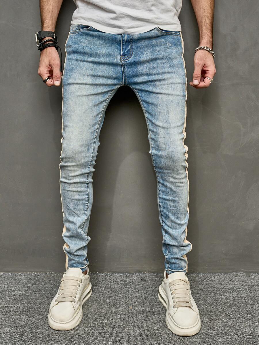 Jeans para hombres de algodón con costura lateral contrastante y lavado ajustado/lavado oscuro/largo ajustado con bolsillos cargo/frente liso/estilo light blue/vestimenta adecuada para fiestas con amigos.