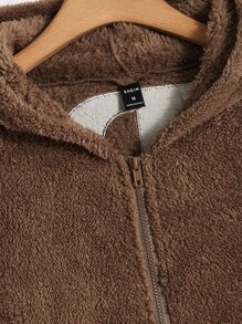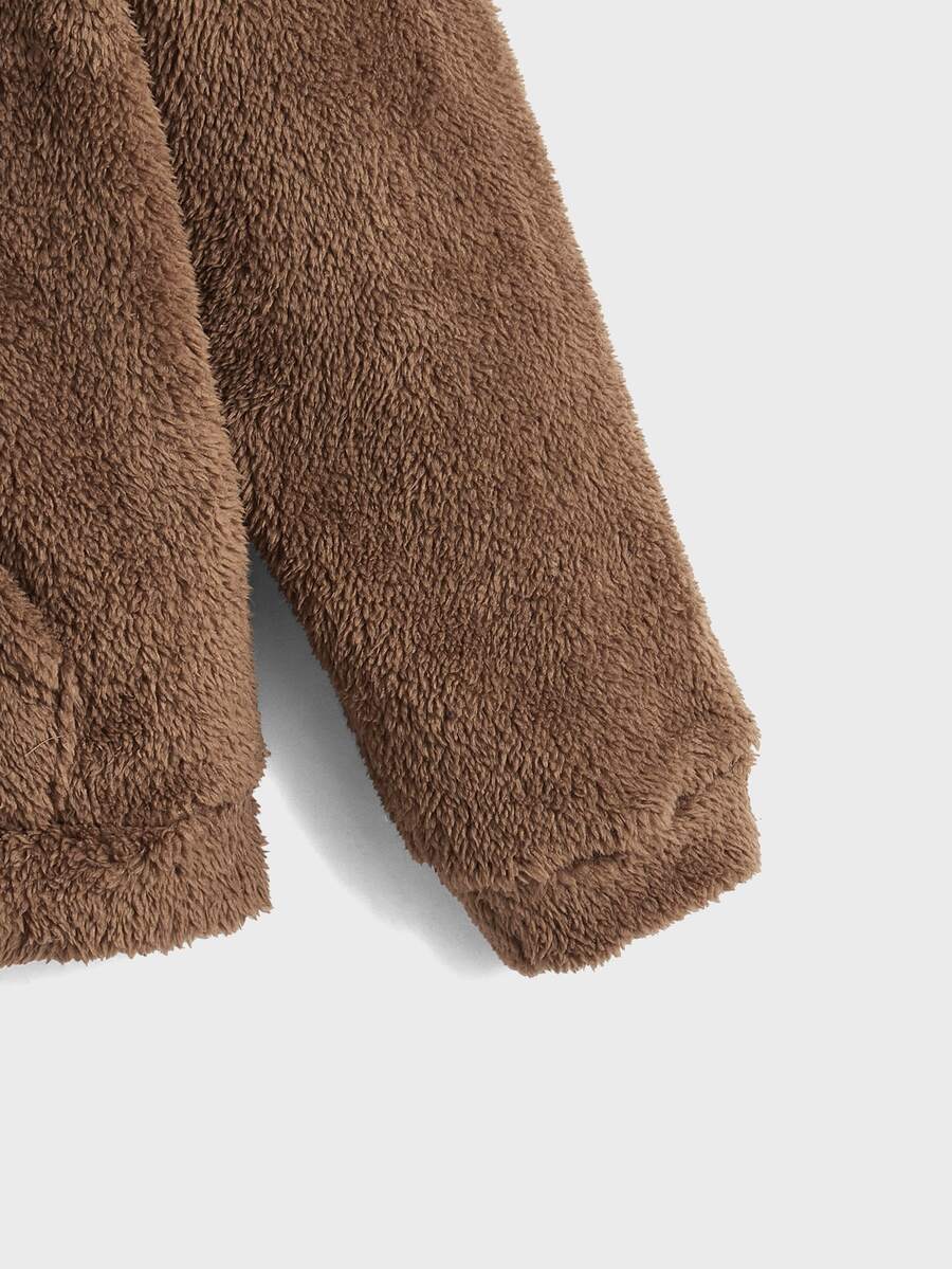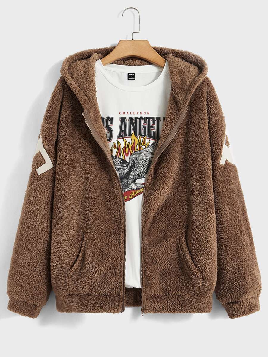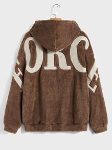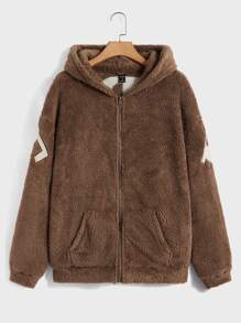 Hombres Cazadora teddy con doble bolsillo con parche de letra con capucha