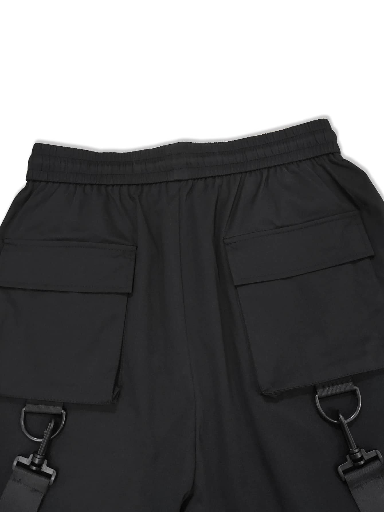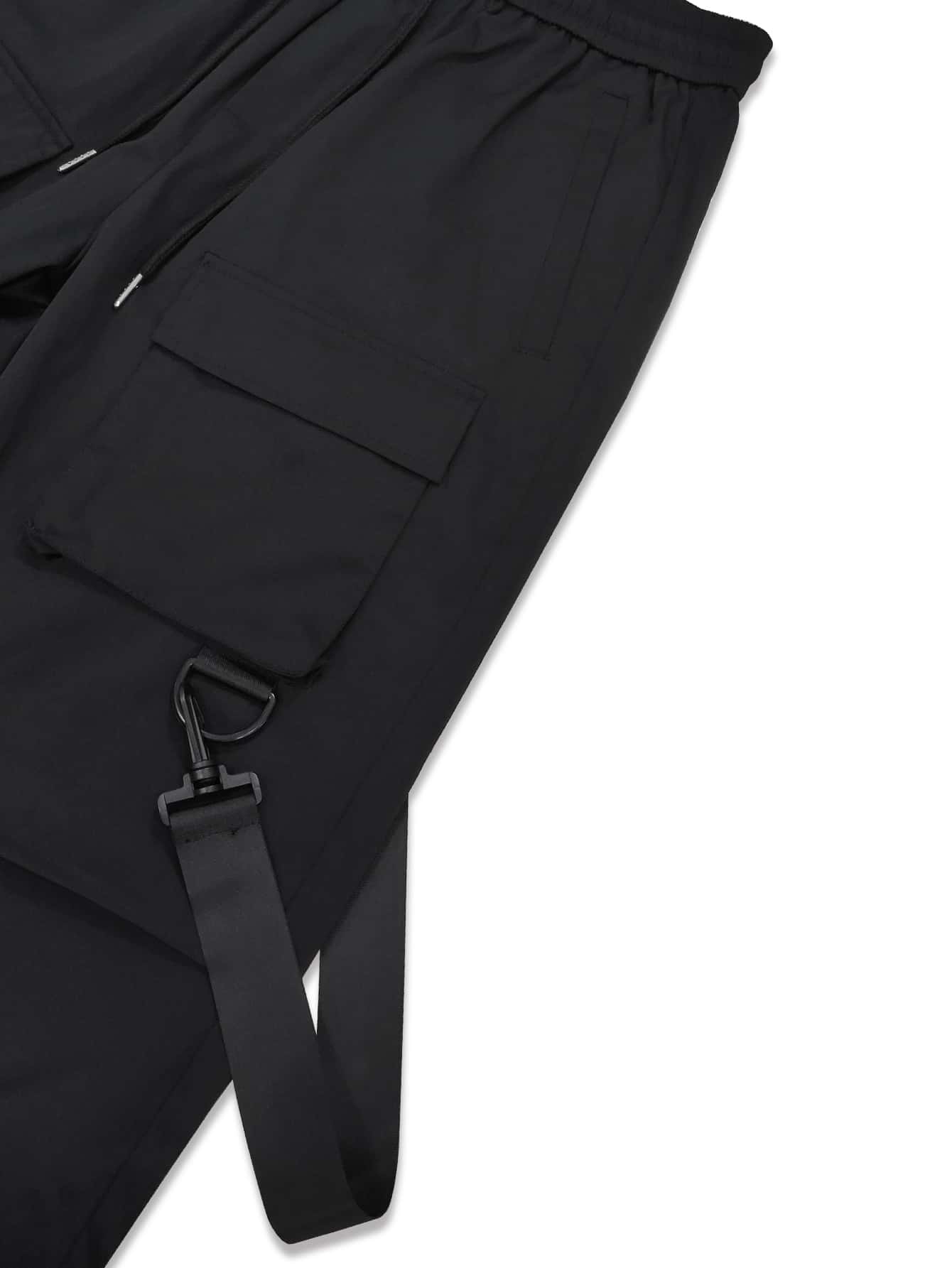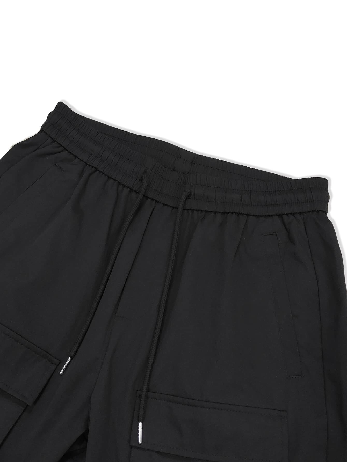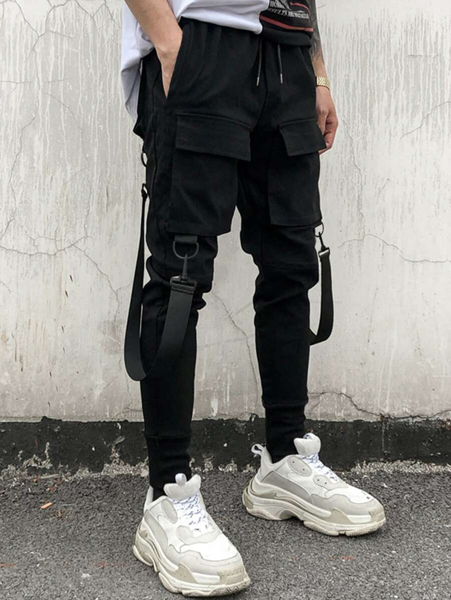 Pantalones holgados de carga con detalle de hebilla y cordón en la cintura, bolsillo con solapa, lisos de color negro para salir, otoño