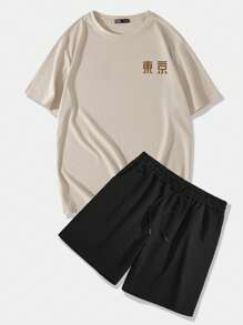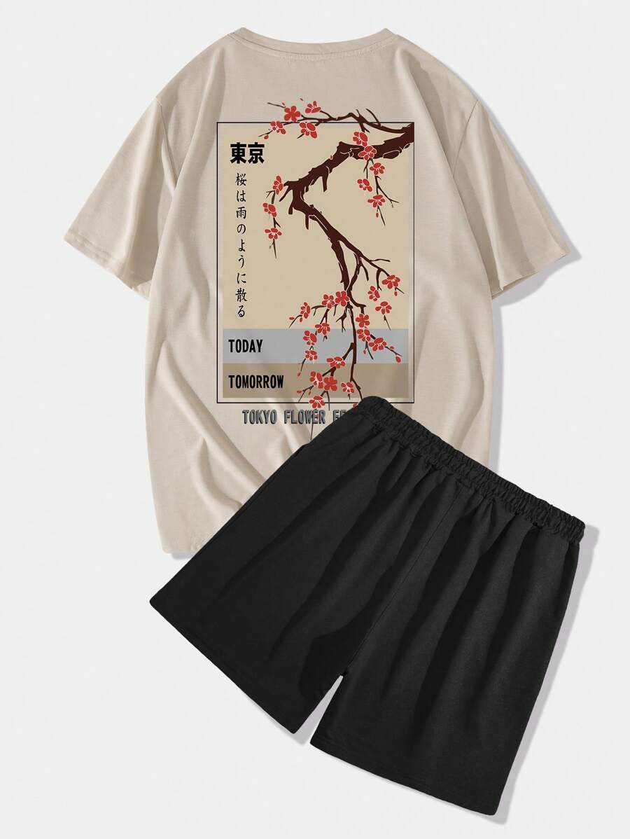 Street Life Hombres floral & con estampado de letra japonesa Camiseta & de cintura con cordón Shorts