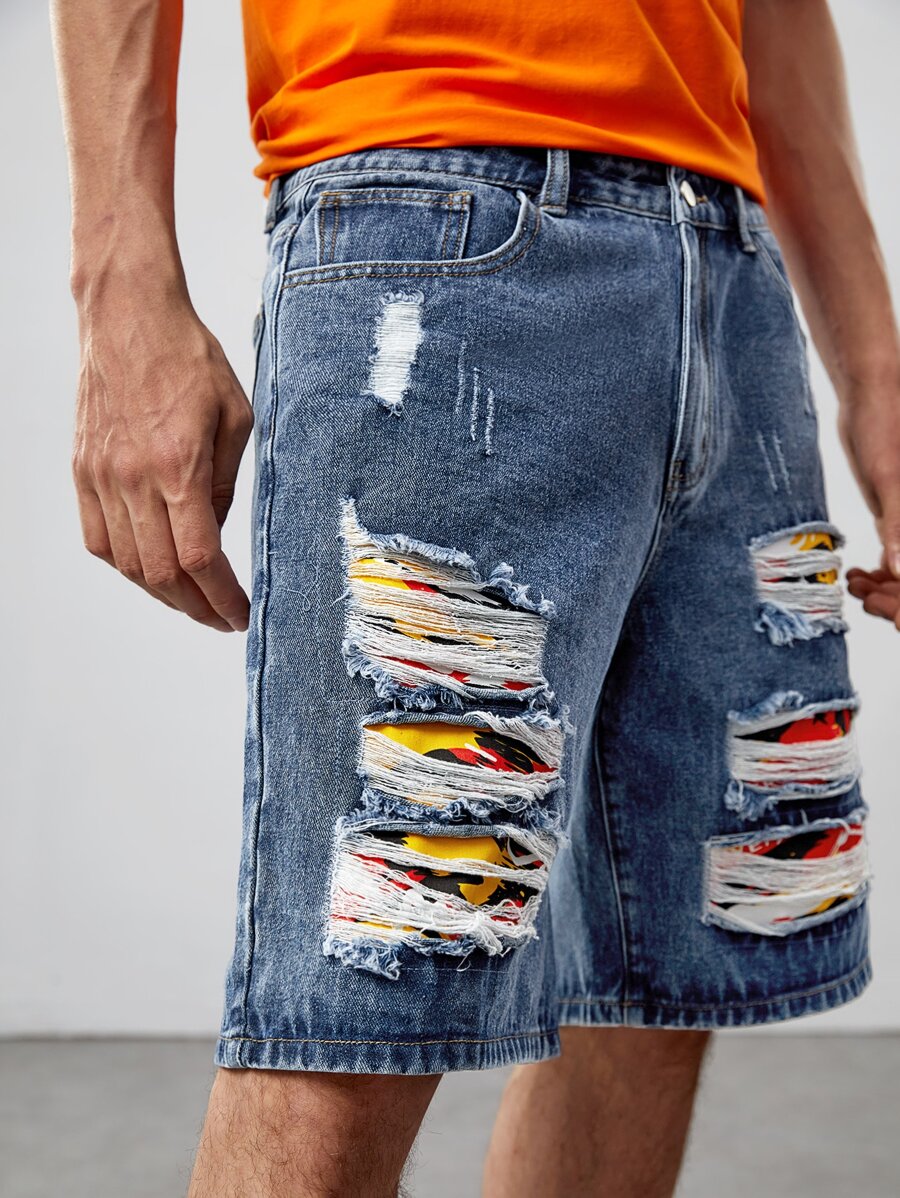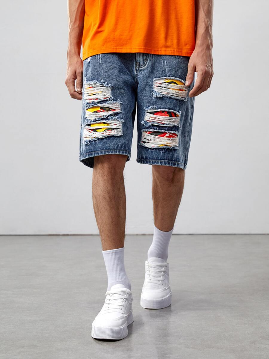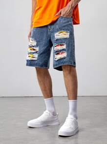 Shorts De Mezclilla Agrietados Con Gráficos Para Hombres