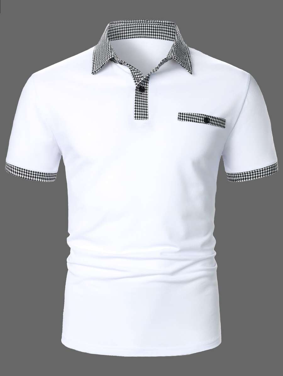 Camisa de polo para hombre, con patrón de pata de gallo y cuello con contraste de color. Con media botonadura y bloque de color, ideal para el trabajo y ocasiones casuales. Conjunto perfecto para esposo.