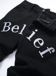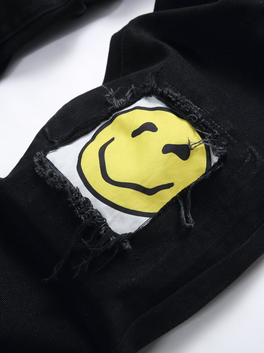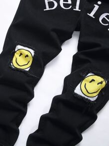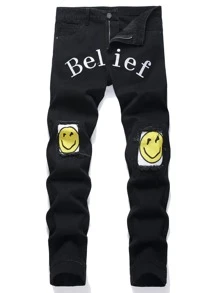 Jeans con parches de letras y cara de dibujos animados para hombre