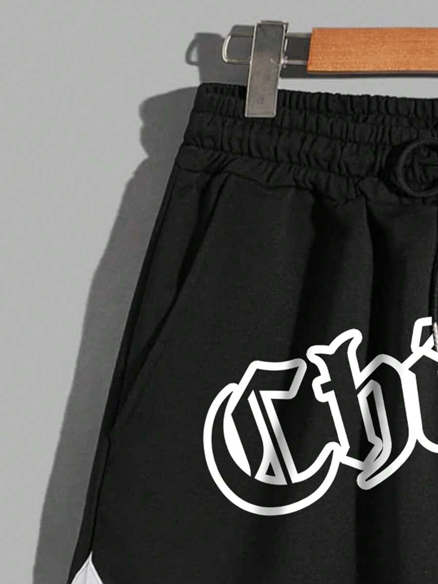Pantalones cortos holgados para hombre con gráfico de letras, cinta de contraste y cordón en la cintura
