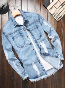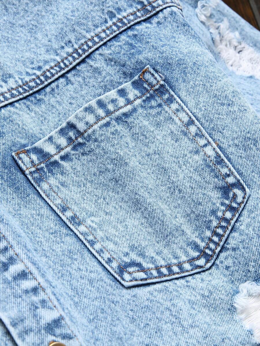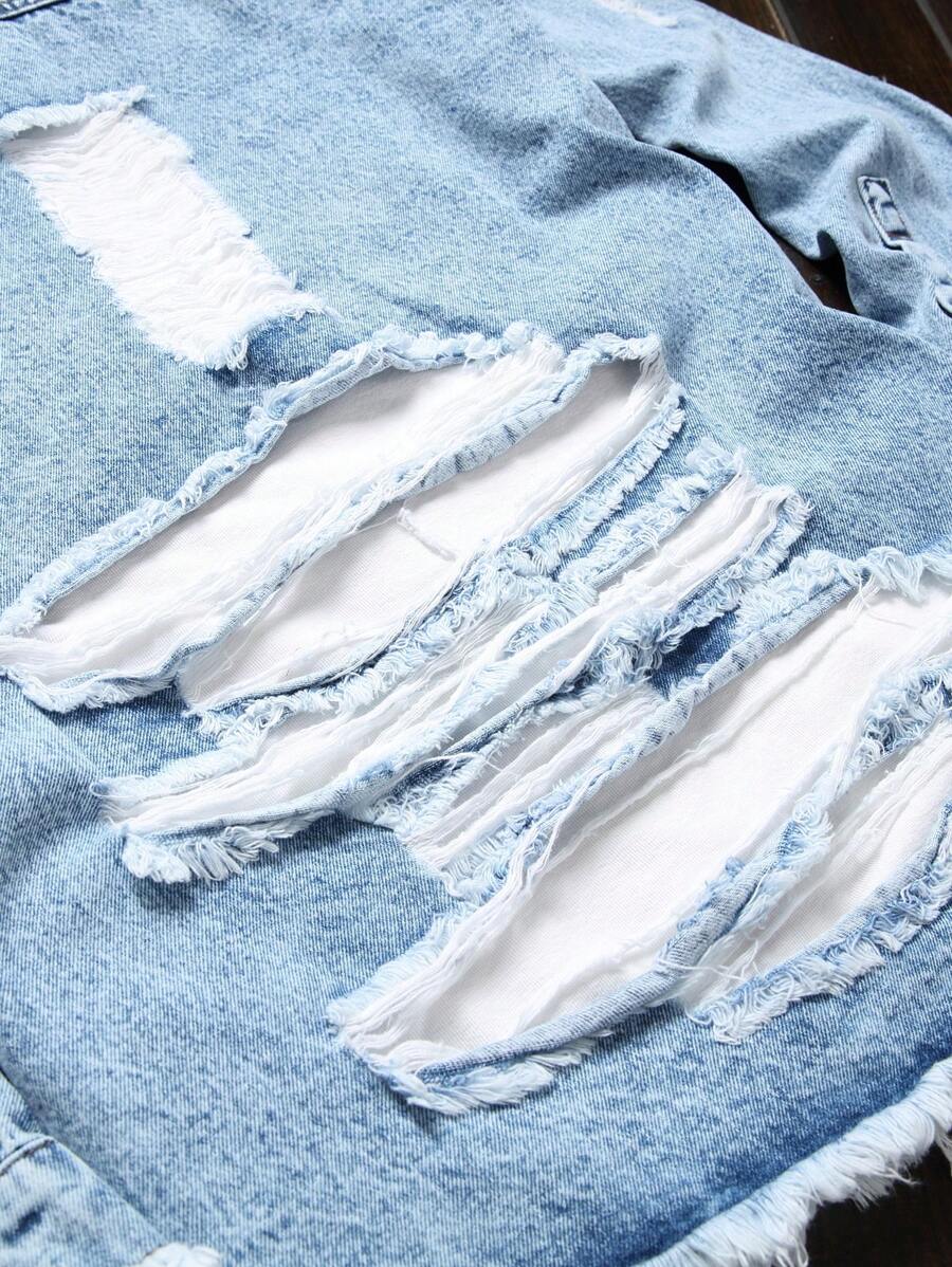 Camisa vaquera de manga larga con botones, sin camiseta, de corte desgastado, con terminación deshilachada y cruda para hombre, ideal para vacaciones y amigos