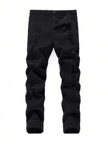 Jeans ajustados rasgados de algodón para hombre, corte estrecho largo lavado dark wash, estilo de cargamento, color negro liso, básicos de trabajo para esposo