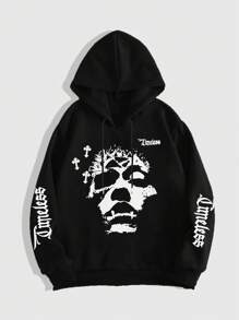 Goth Hombres Capucha con estampado de cráneo y letra con cordón con forro térmico